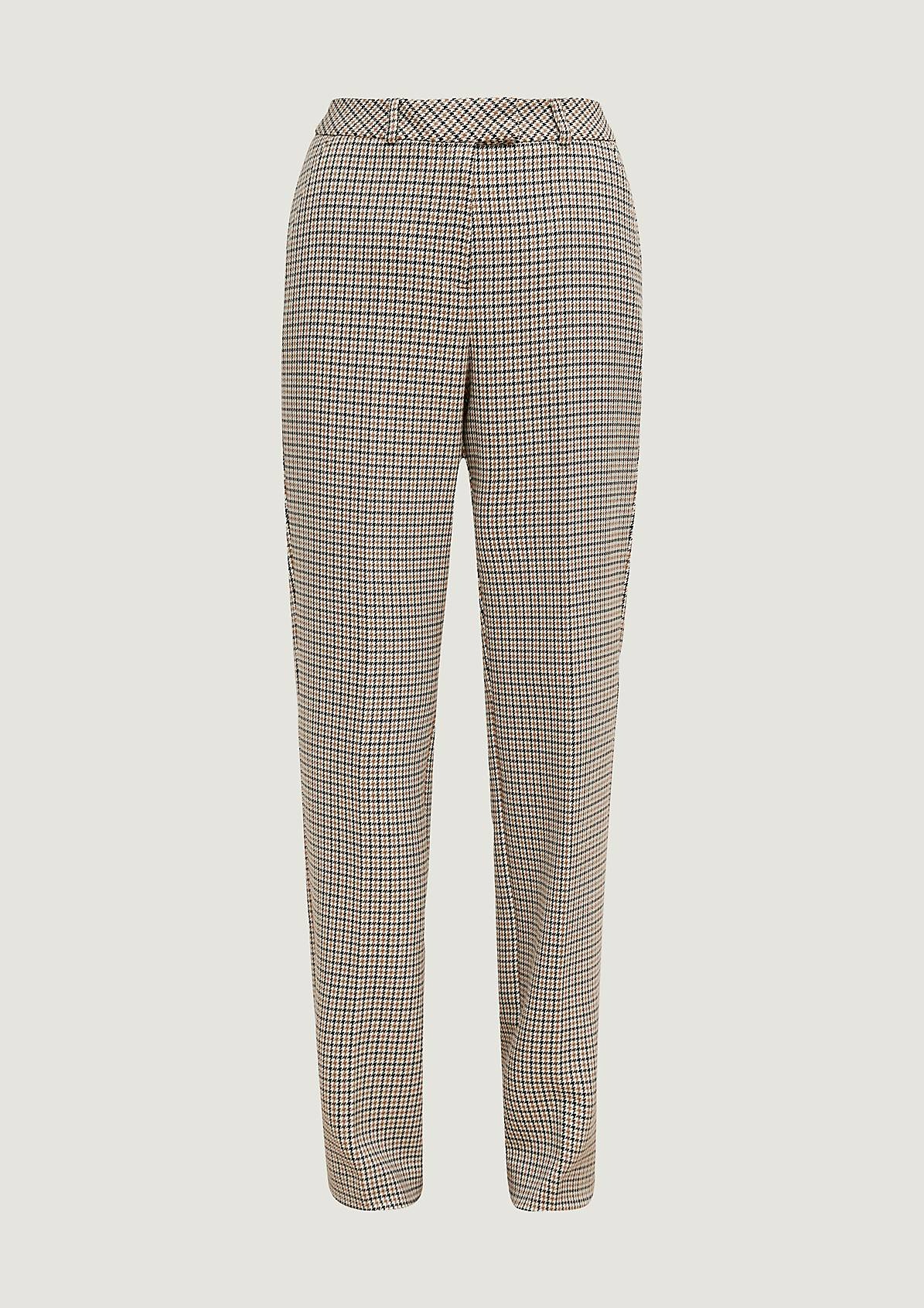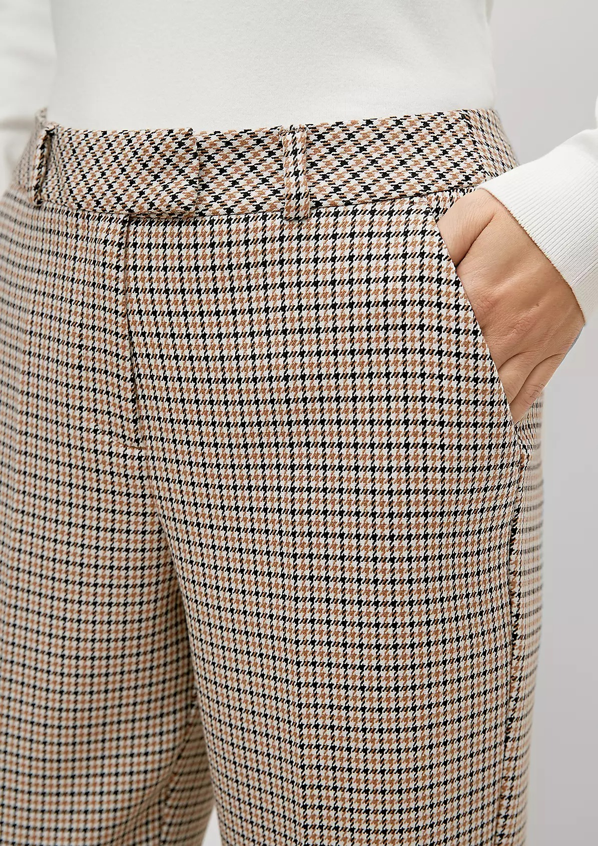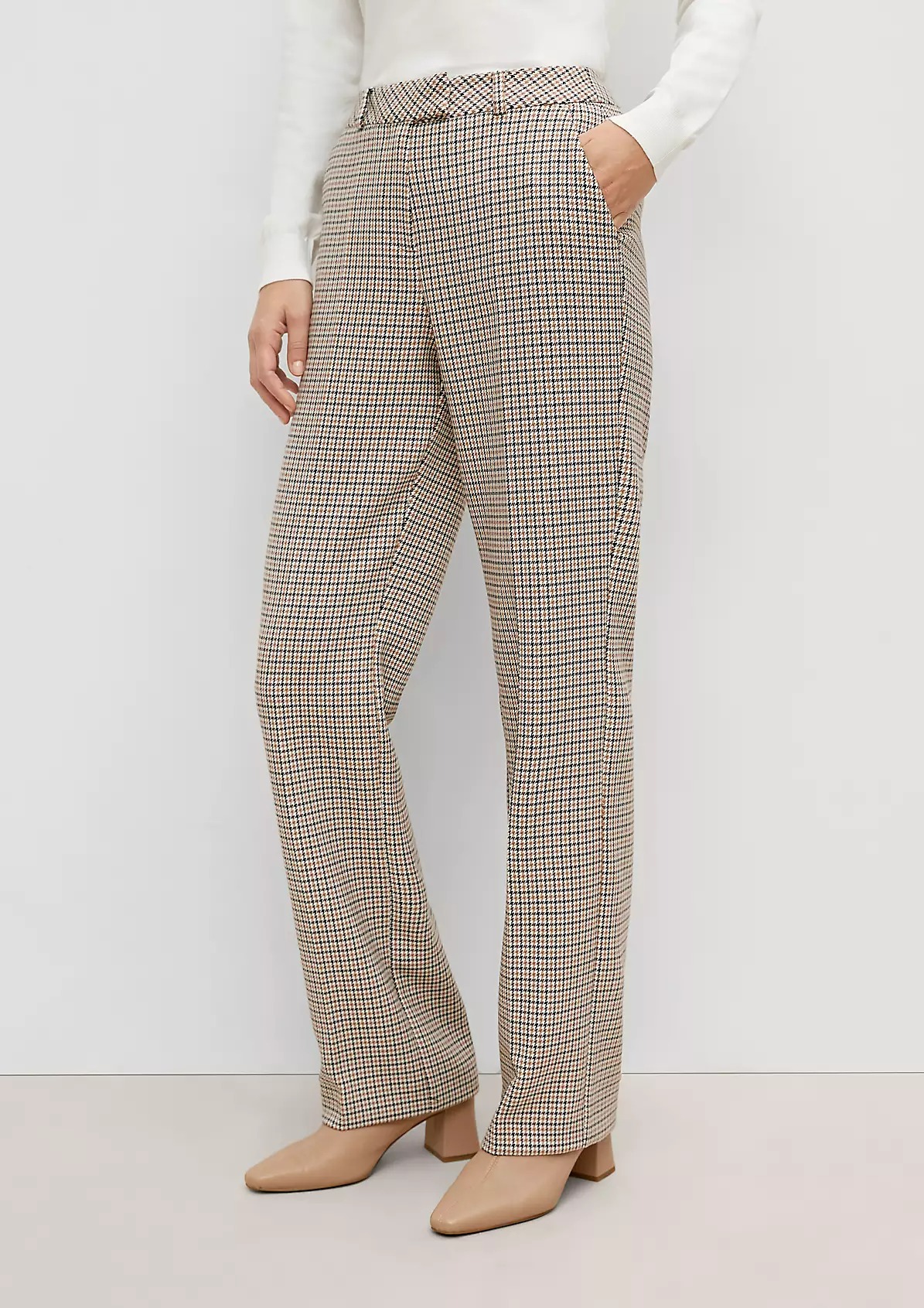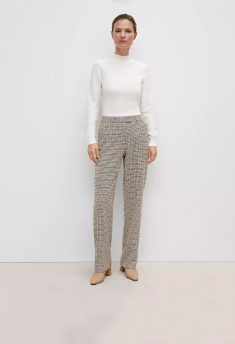 На сайте указаны российские размеры. Брюки классического кроя принта гусиная лапка. Застежка: молния, пуговица, крючок. Впереди прорезной карман, сзади ложный. Длина штанины по внутренней стороне для размера 42 около 78 см. Рост модели: 179 см