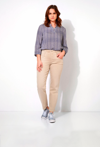 На сайте указаны российские размеры. Летние джинсы средней посадки с изысканным решением карманов, средней высоты поясом, длиной до щиколотки и прямой посадкой. Рост модели 178 см.