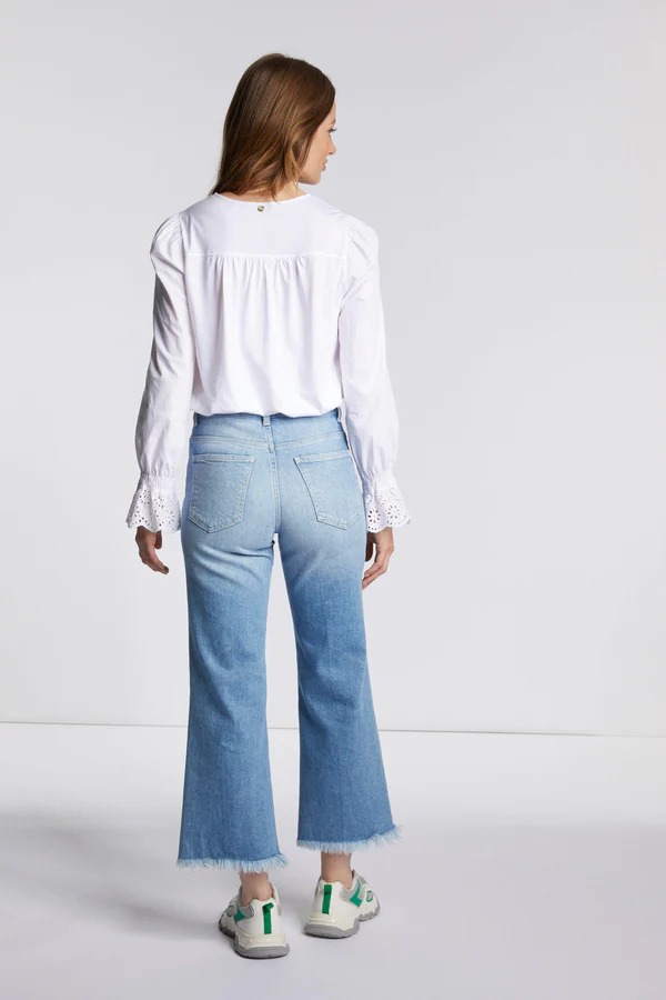 На сайте указаны российские размеры. Брюки-кюлоты из синего денима с высокой посадкой прямо в тренде. Тем более, что ее широкая нога красуется в укороченном стиле с бахромой. Классические детали: застежка на молнию и четыре кармана. Джинсы также отличаются экологичностью. Длина в размере 42: 67 см. Рост модели 177 см.