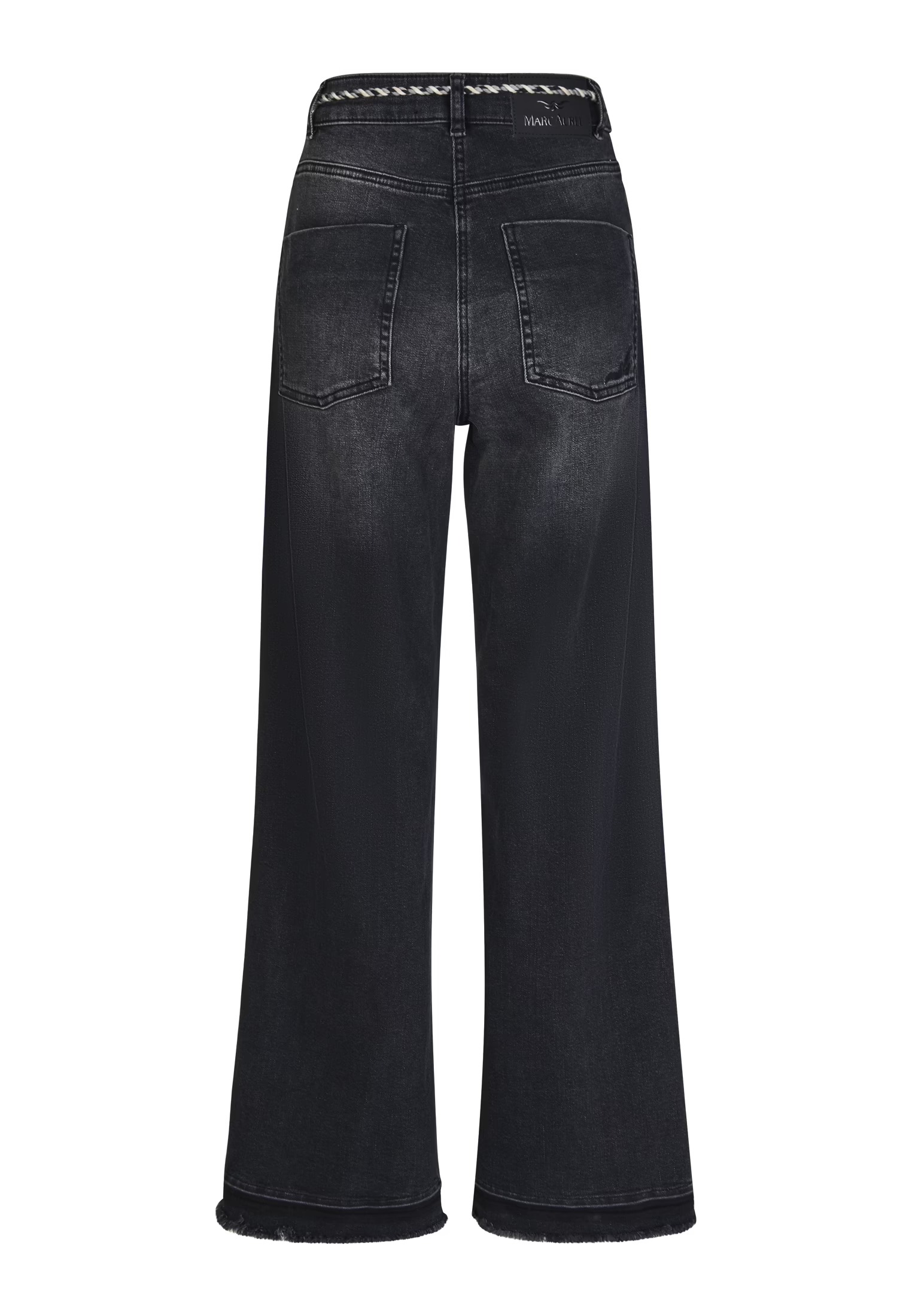 На сайте указаны российские размеры. Изготовленные из мягкой и прочной черной джинсовой ткани, эти джинсы привлекают внимание модным заниженным краем и съемной кулиской. Модель широкого кроя с пятью карманами отличается свободным кроем и высокой талией.