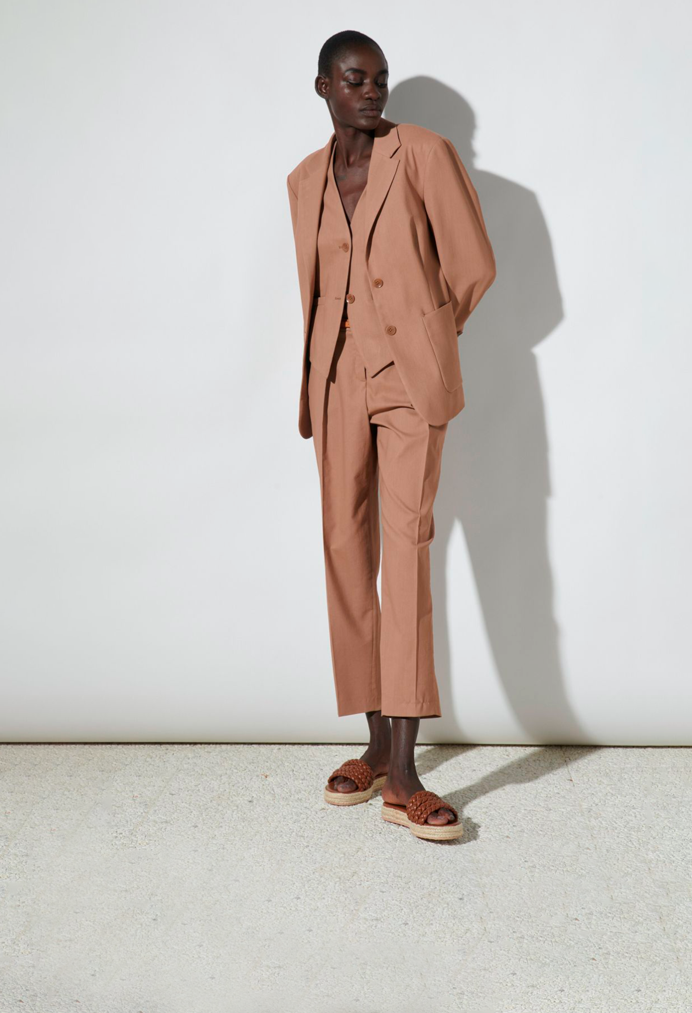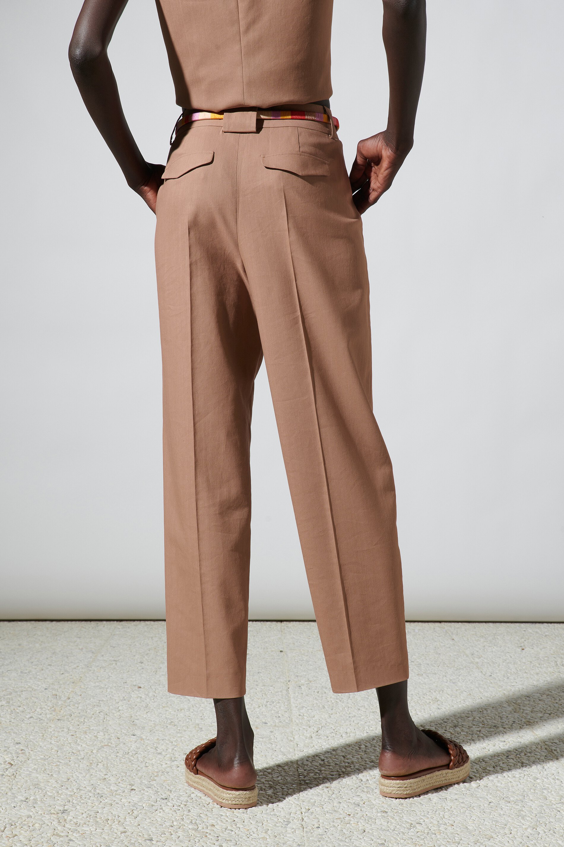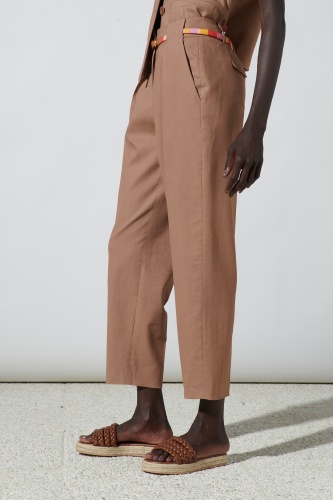 На сайте указаны российские размеры. Брюки из легкого габардина с летней текстурой крепа и зауженным кроем. Слегка укороченный фасон со складками спереди и широкими шлевками для ремня создает стильный образ. Рост модели 178 см.