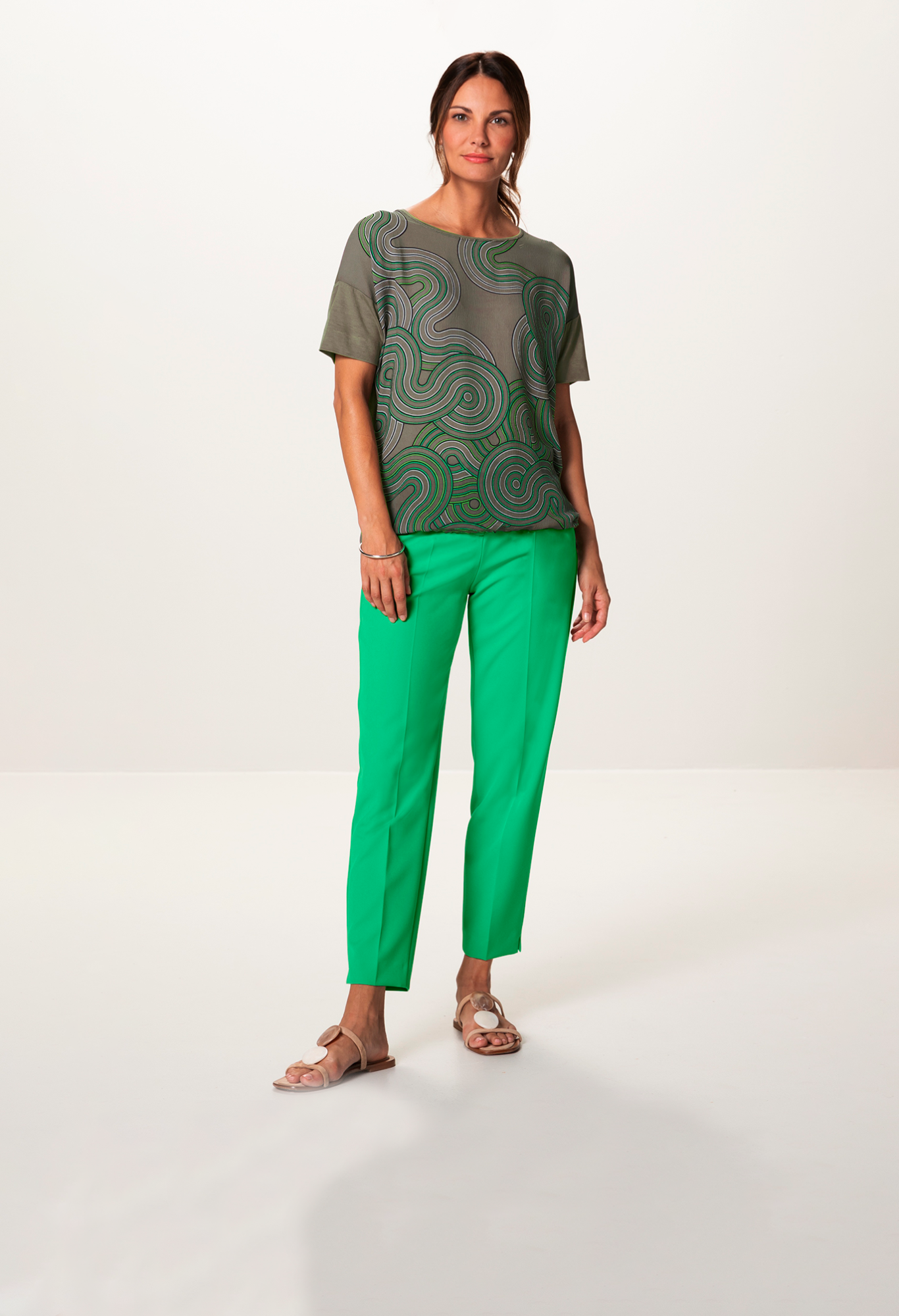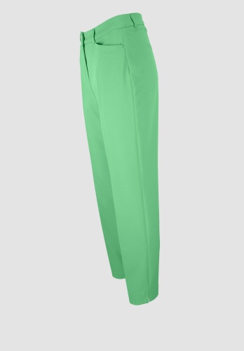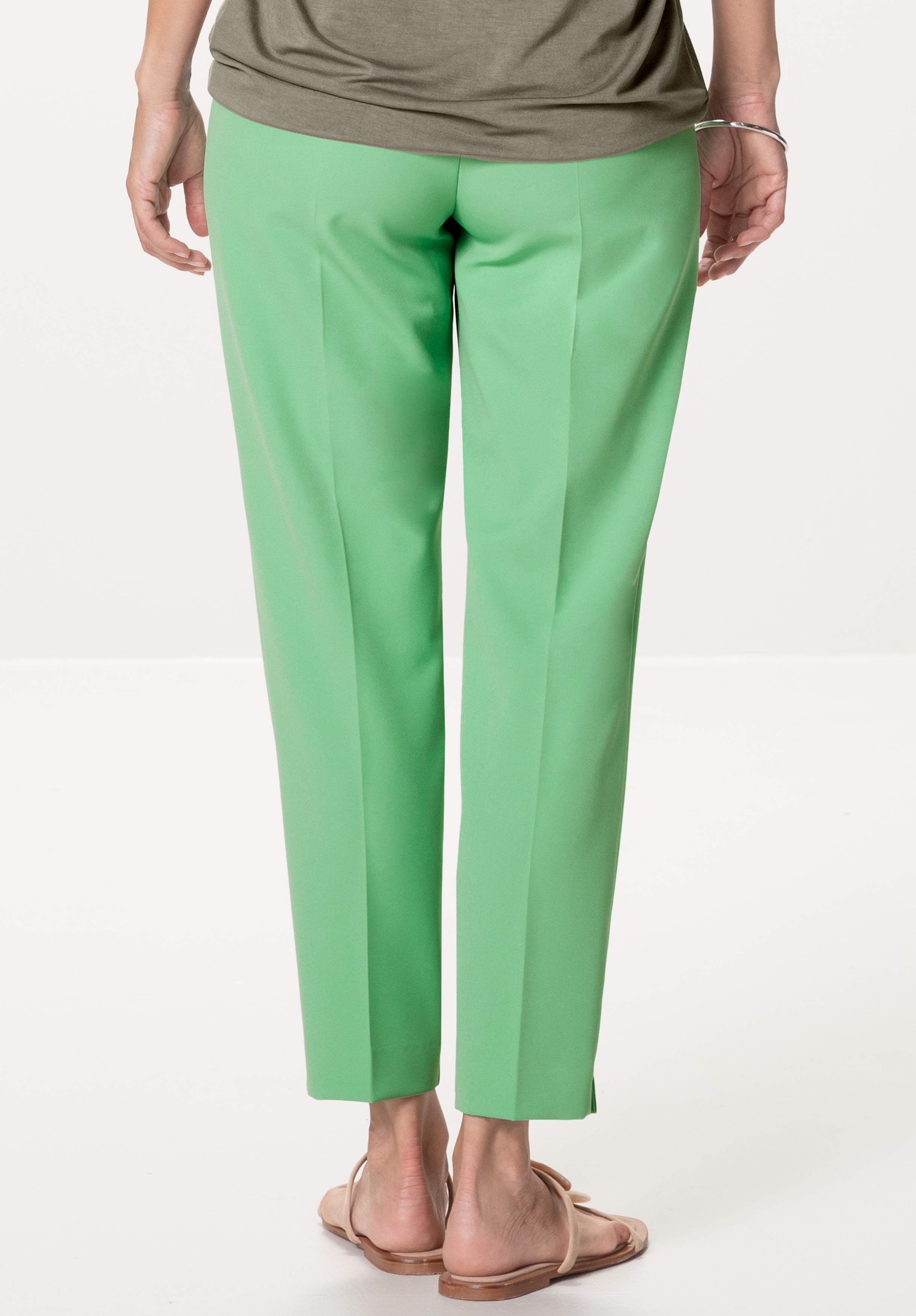 На сайте указаны российские размеры. Модные стрейчевые брюки. Благодаря высококачественному материалу с эластичным эластаном и застежке на крючок спереди она невероятно удобна. Передние карманы в сочетании со складкой и небольшими разрезами по низу завершают повседневный образ укороченных брюк прямого кроя. Длина в размере 44 около 68 см.