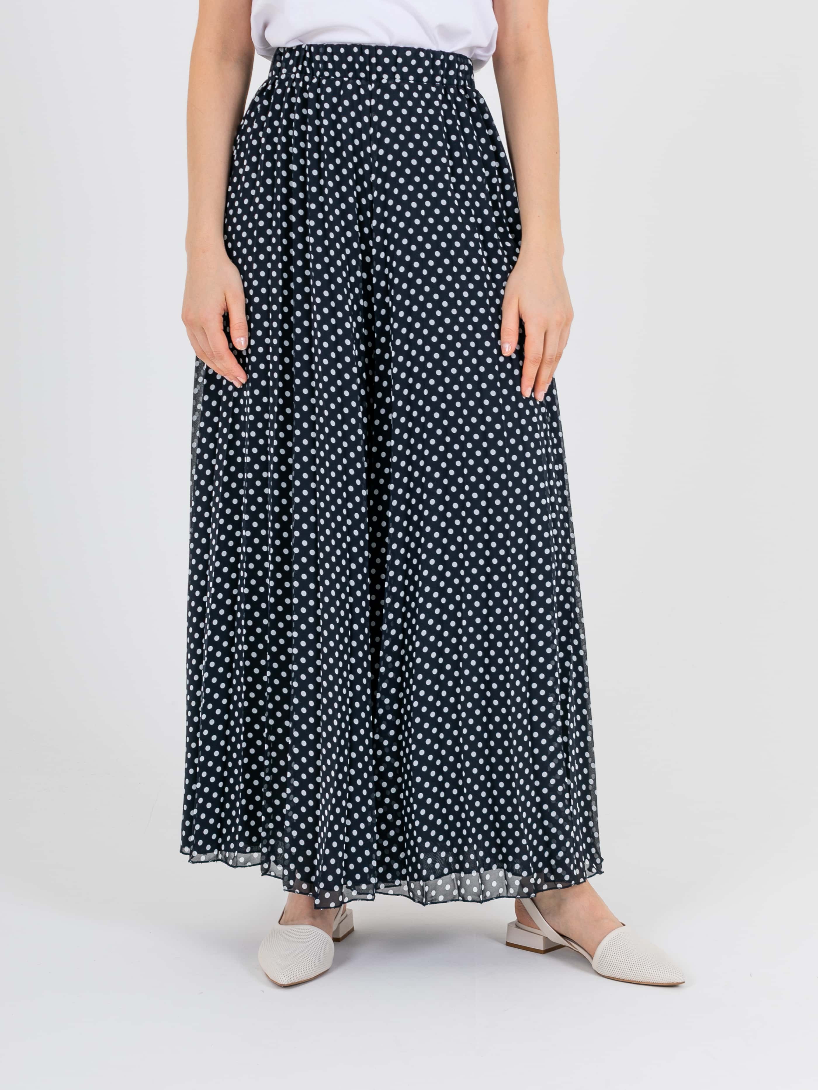 Длинные легкие брюки «палаццо», дизайнерская особенность модели – яркий принт «горошек» и плиссировка. Верх брюк обработан поясом на резинки. Брюки на подкладке.