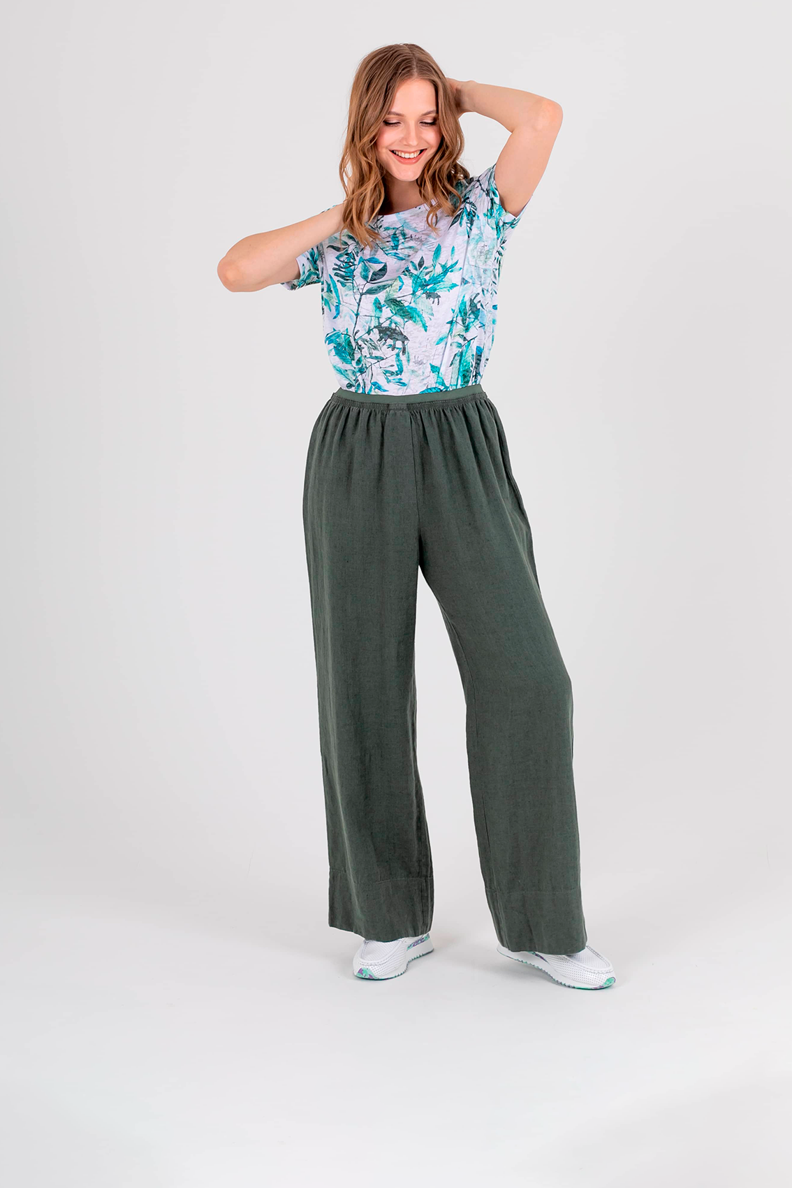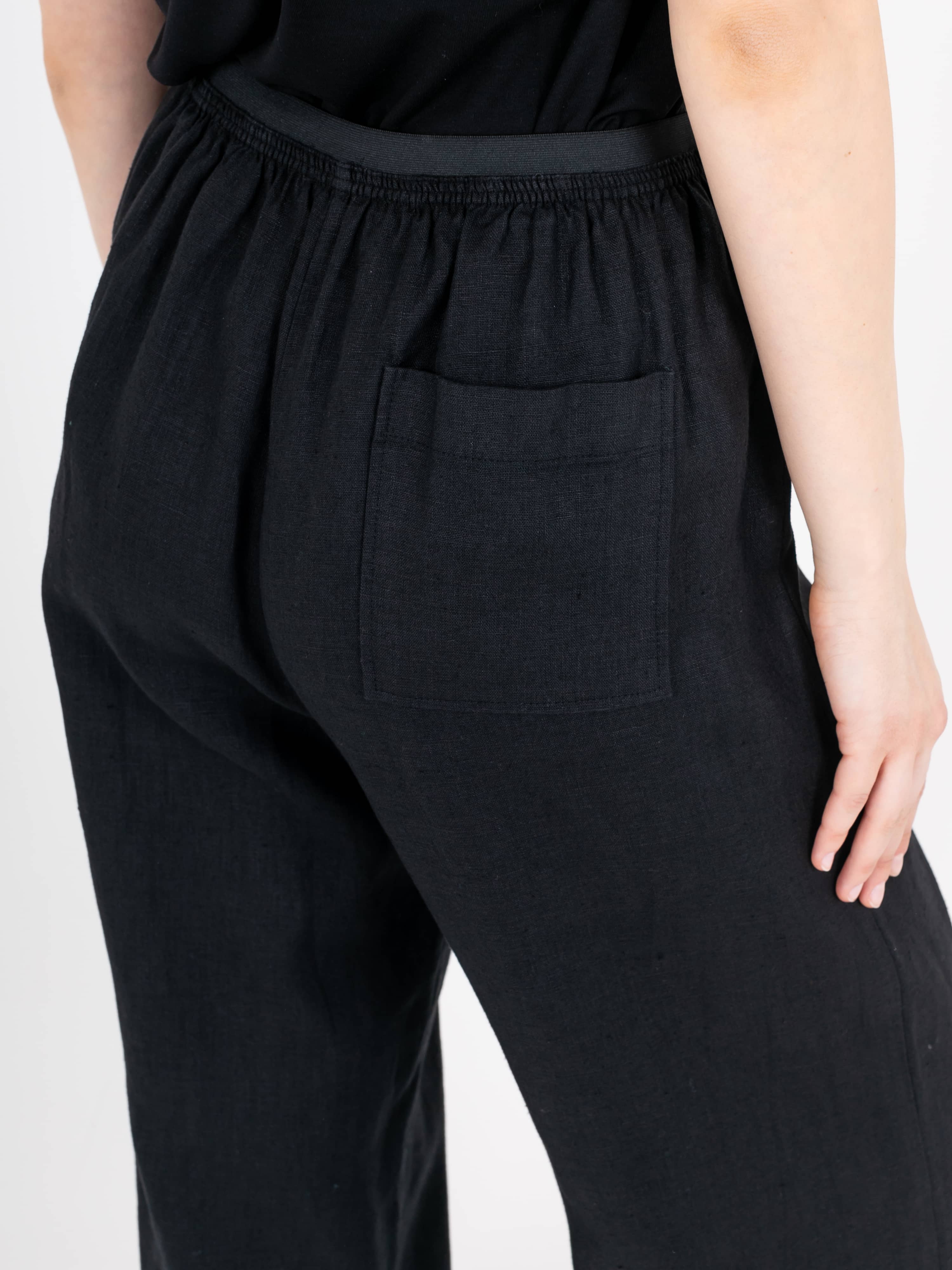 Прямые удлиненные брюки «трубы» из натурального льна. На правой задней половинке брюк расположен накладной карман. Верх брюк на резинке.