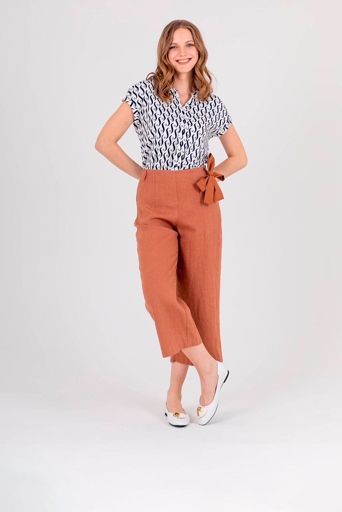 Укороченный прямые брюки, длиной до щиколоток «трубы» с застежкой на молнию в боковом шве из натурального льна. На передних половинках расположены два кармана с отрезным бочком. Верх брюк обработан поясом на резинке и со шлевками, также есть съемный пояс.