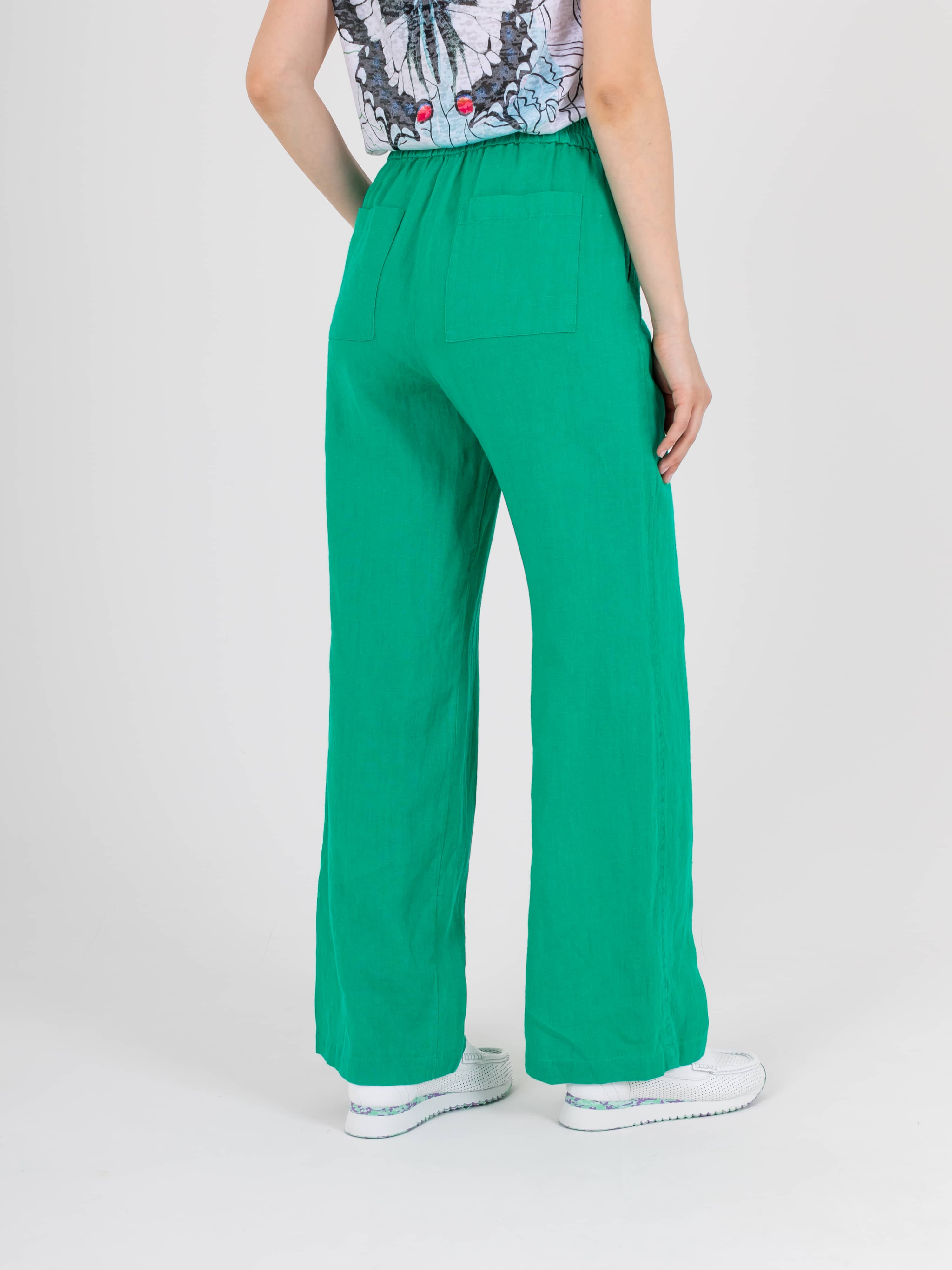 Прямые удлиненные брюки «трубы» из натурального льна. На передних половинках расположены два кармана с отрезным бочком. На задних половинках брюк расположены накладные карманы. Верх брюк на резинке со шнуром для регулировки объема.