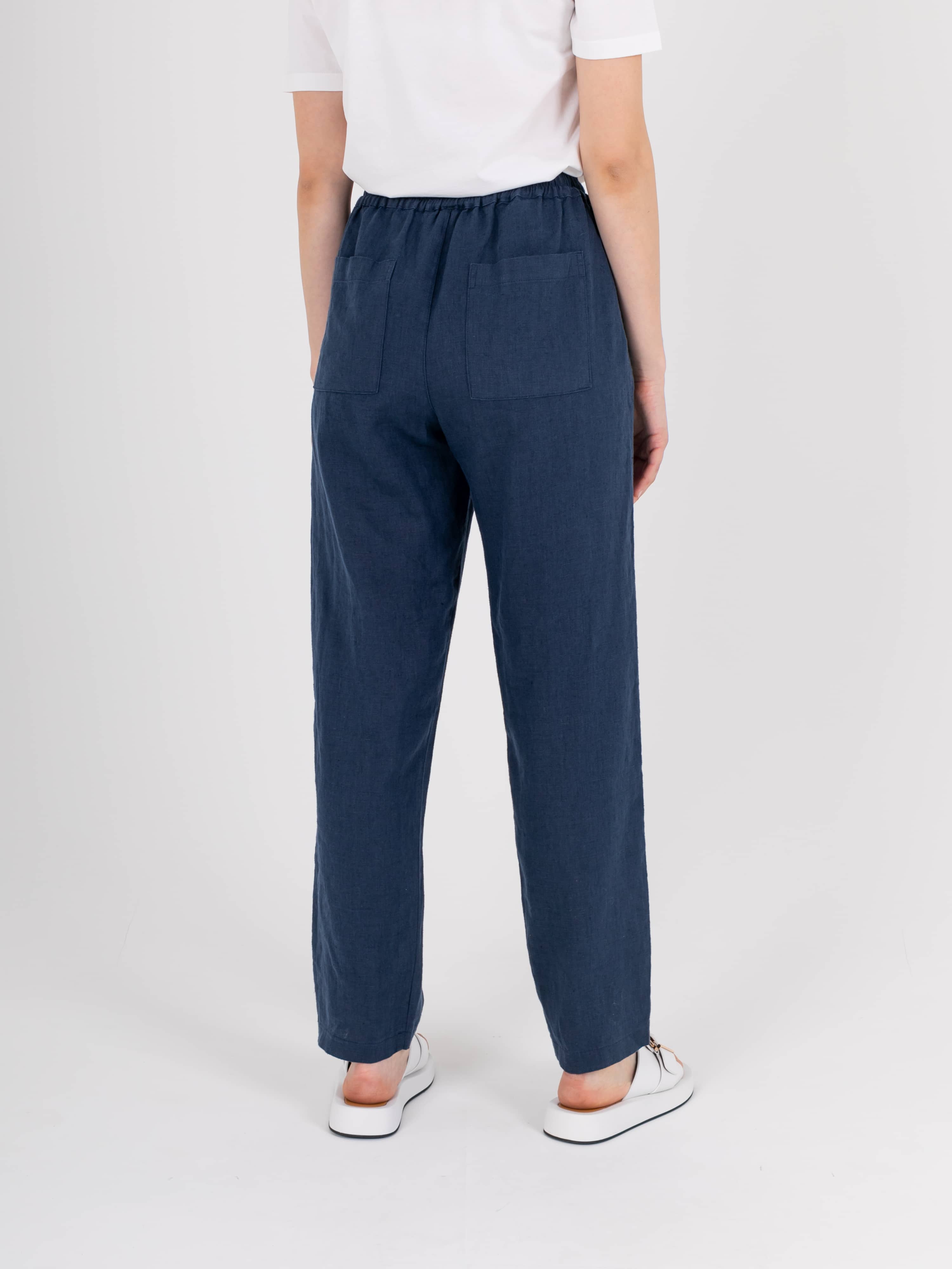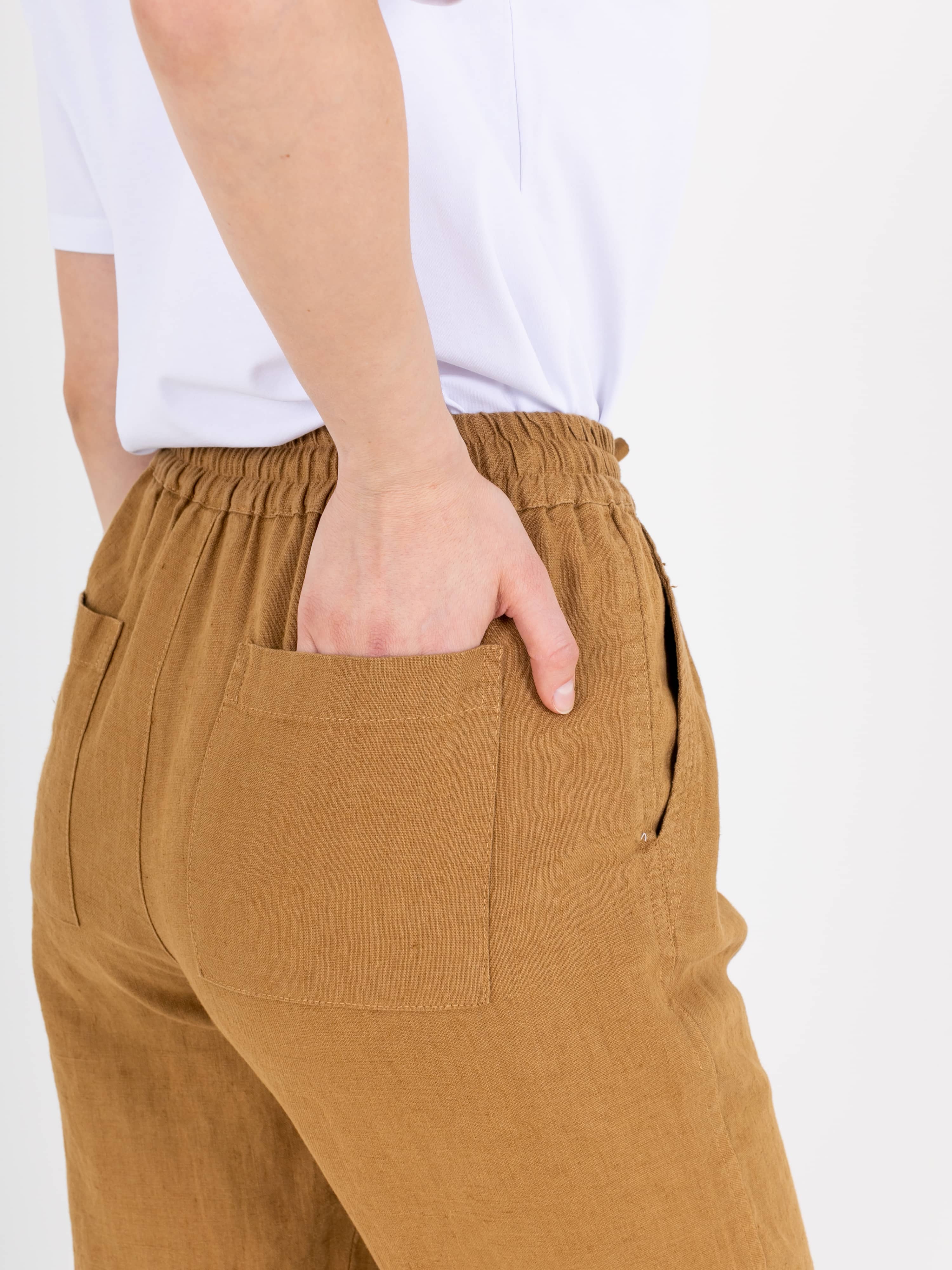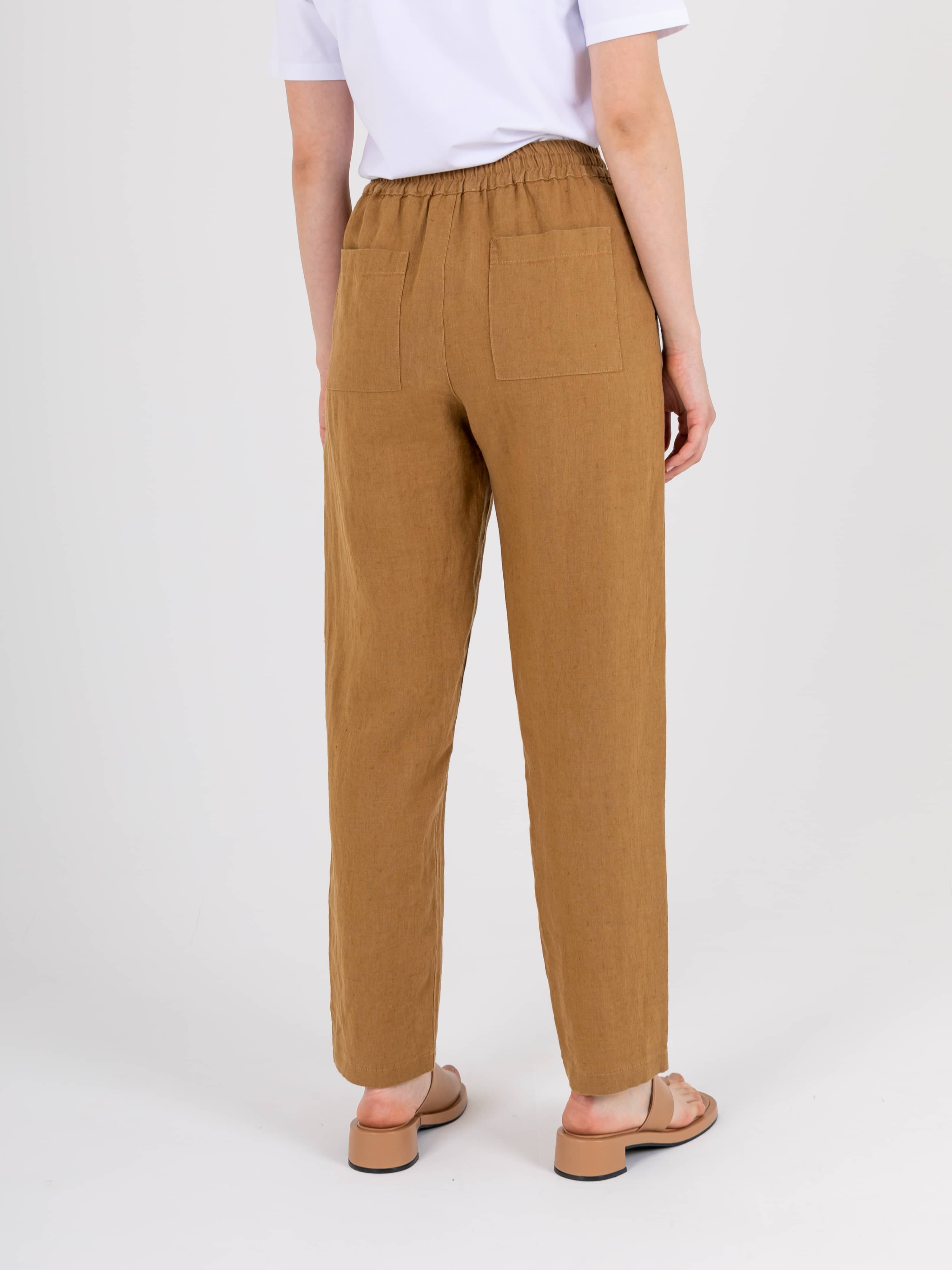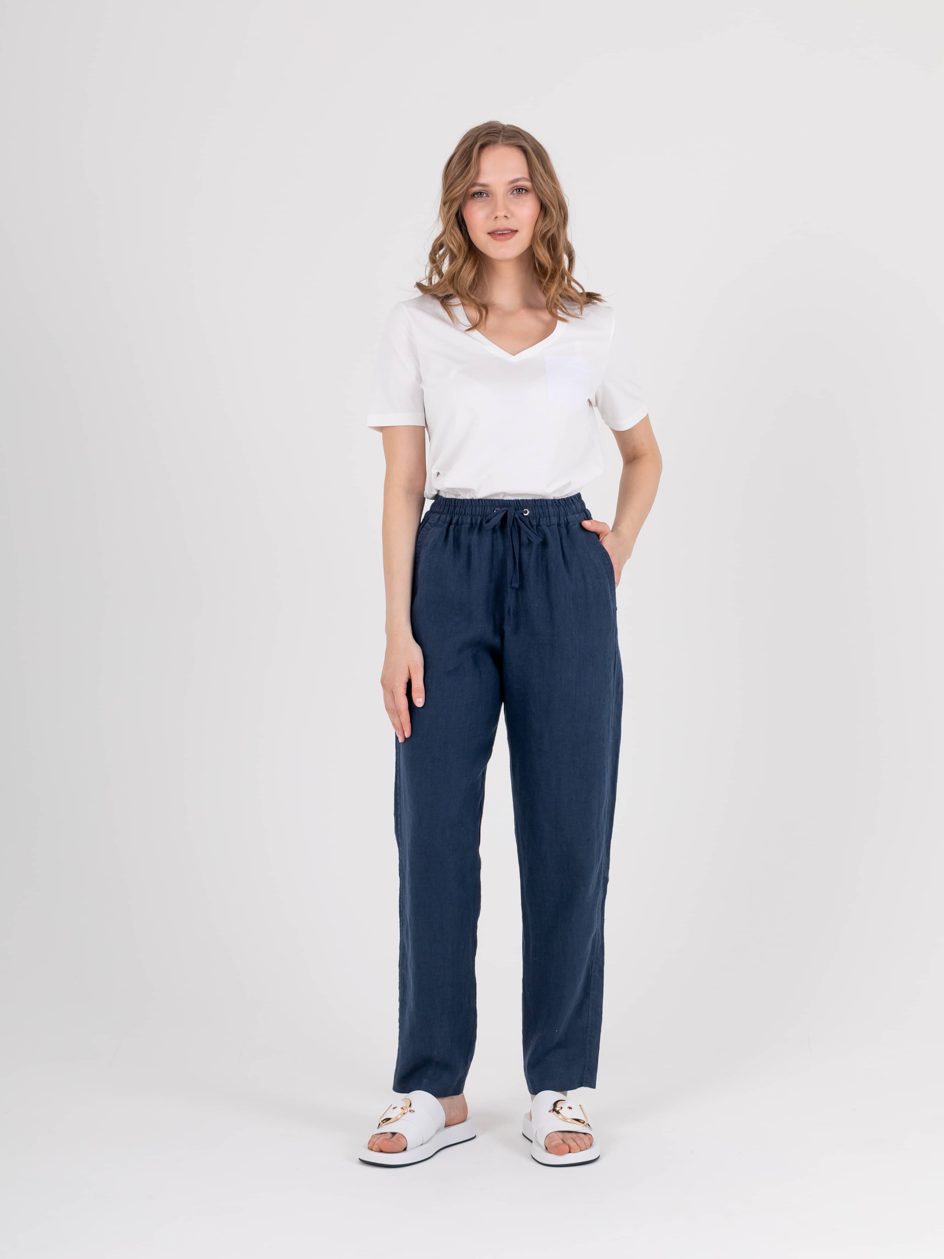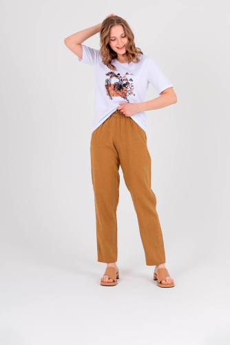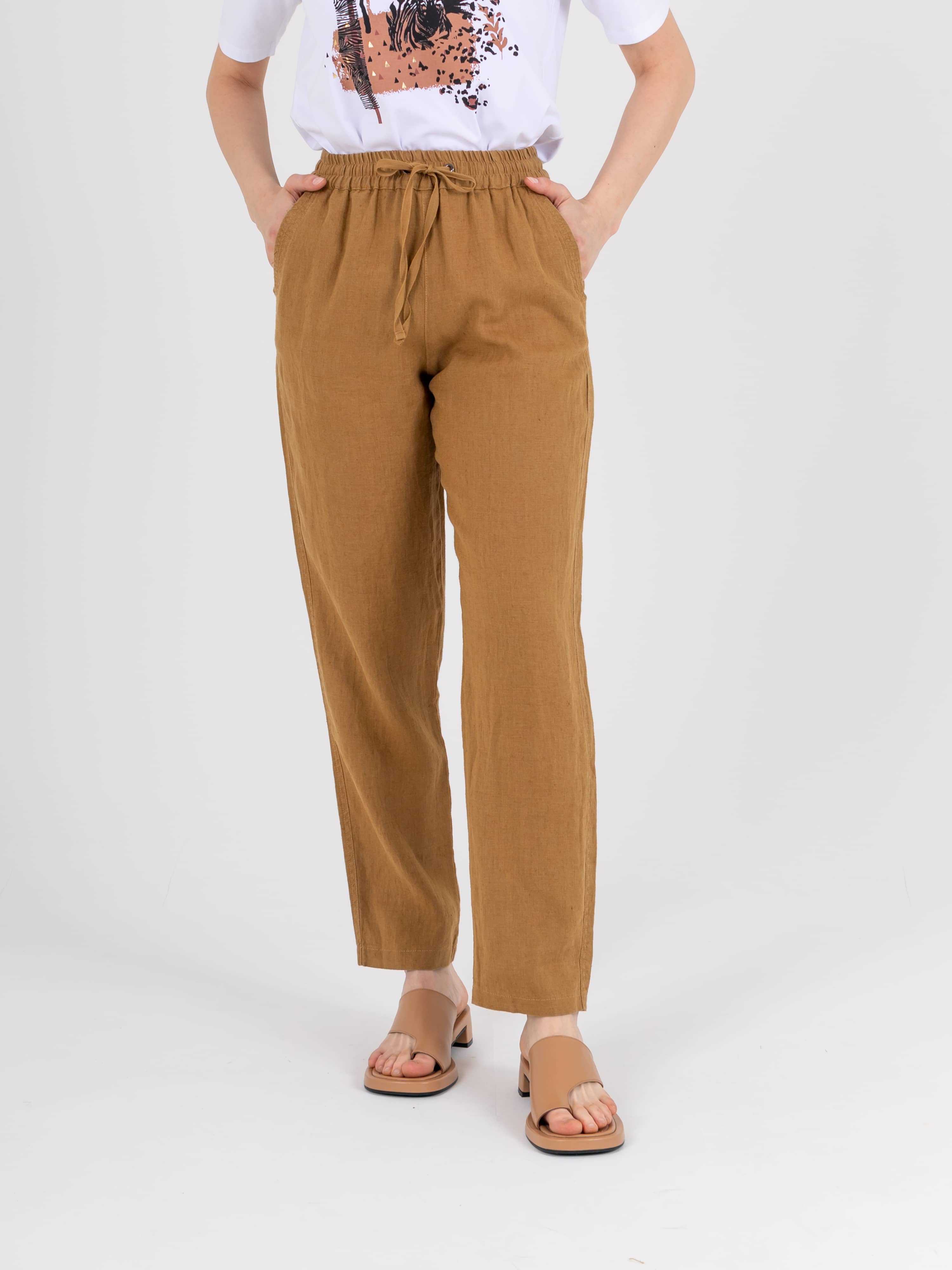 Прямые брюки с завышенной талией, длиной до щиколоток. На передних половинках расположены два кармана с отрезным бочком. На задних половинках брюк расположены накладные карманы. Верх брюк на резинке со шнуром для регулировки объема.