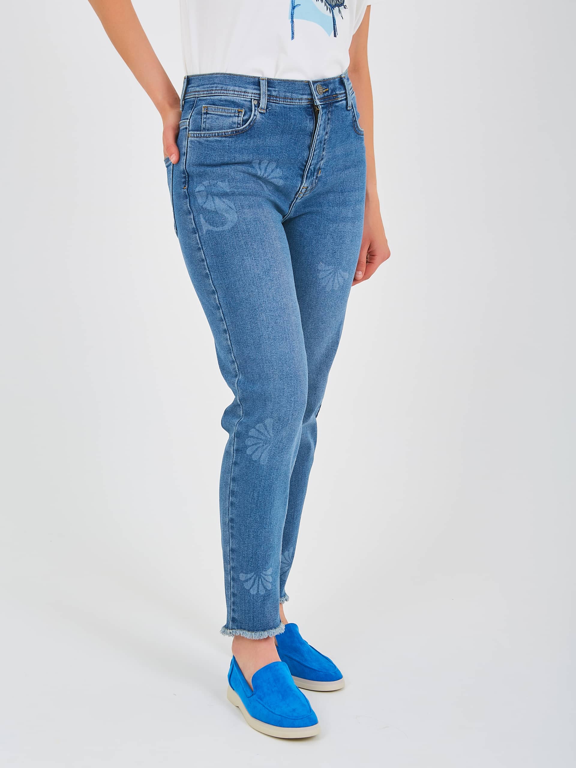 Джинсы «mom» длиной до щиколотки с застежкой на молнию и 1 пуговицу, дизайнерская особенность модели – на передних половинках цветочный принт с логотипом «Stern», вареный эффект и необработанный низ. Джинсы слегка зауженные книзу. На передних половинках расположены два кармана с отрезным бочком и один монетный карман. На задних половинках два накладных кармана и фигурная кокетка. Верх брюк обработан поясом со шлевками.