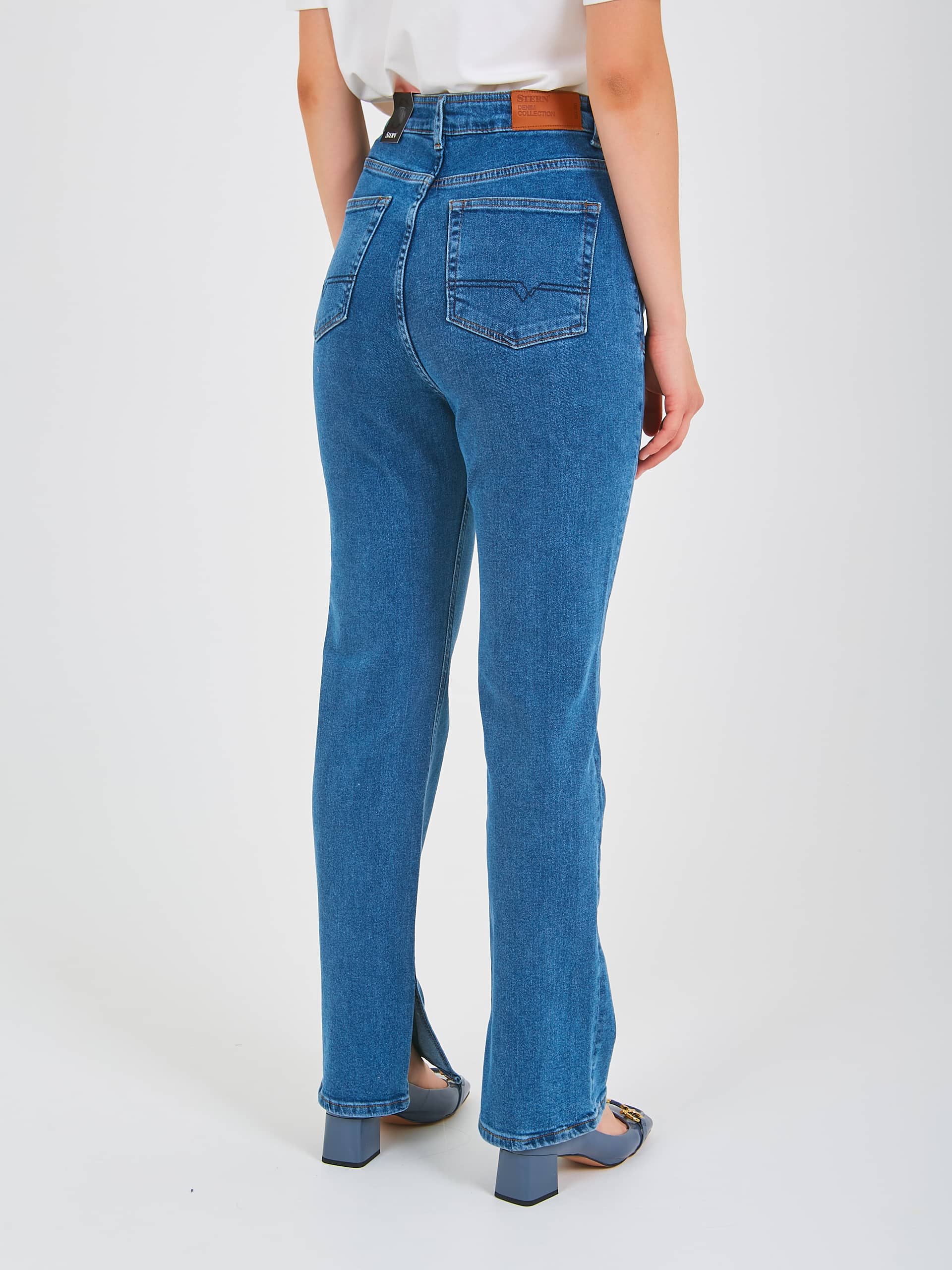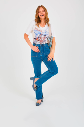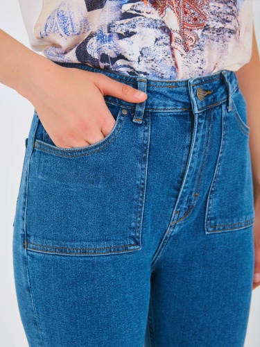 Джинсы «Slim Fit», длина 7/8, с застежкой на молнию и 1 пуговицу. На передних половинках расположены два кармана с отрезным бочком – имитация накладных карманов. На задних половинках два накладных кармана и фигурная кокетка. Верх брюк обработан поясом со шлевками. Низ брюк с внутренними боковыми разрезами.