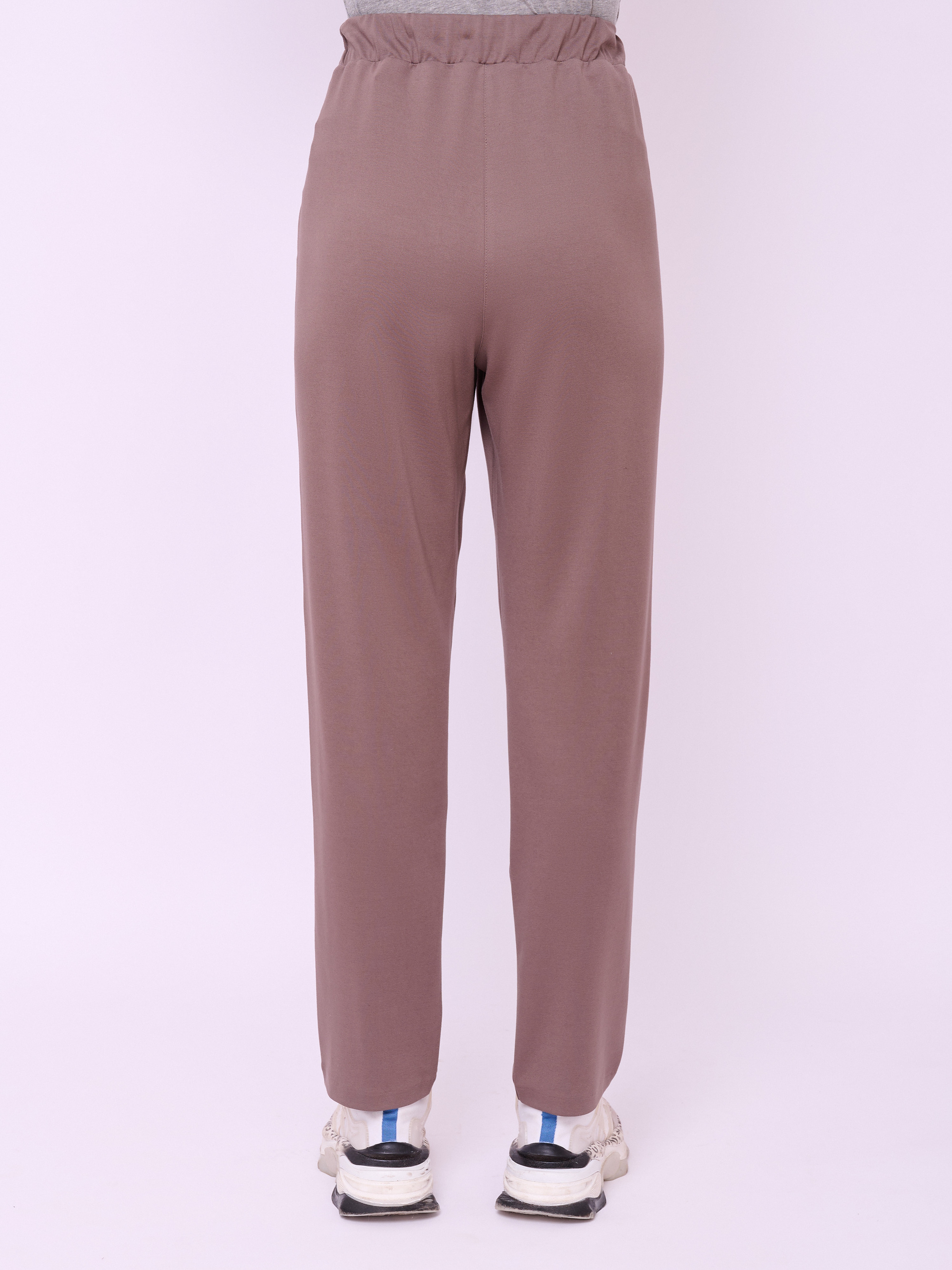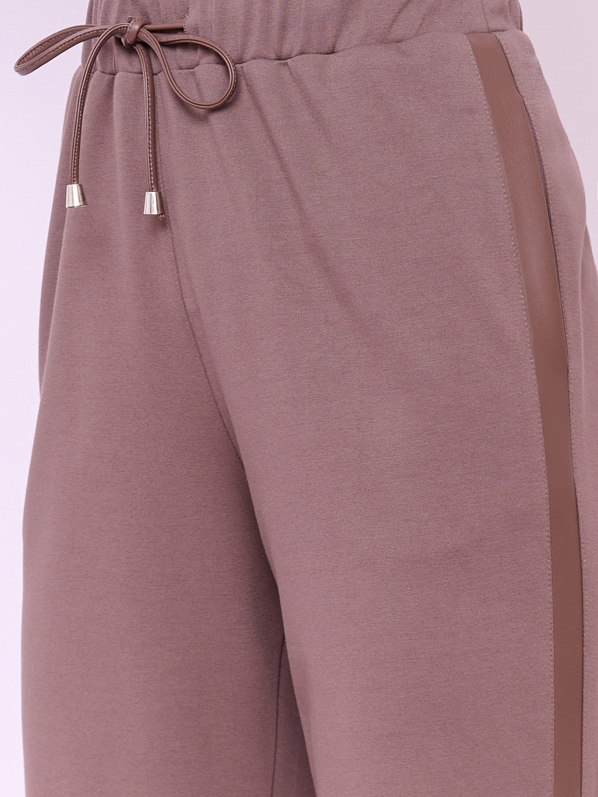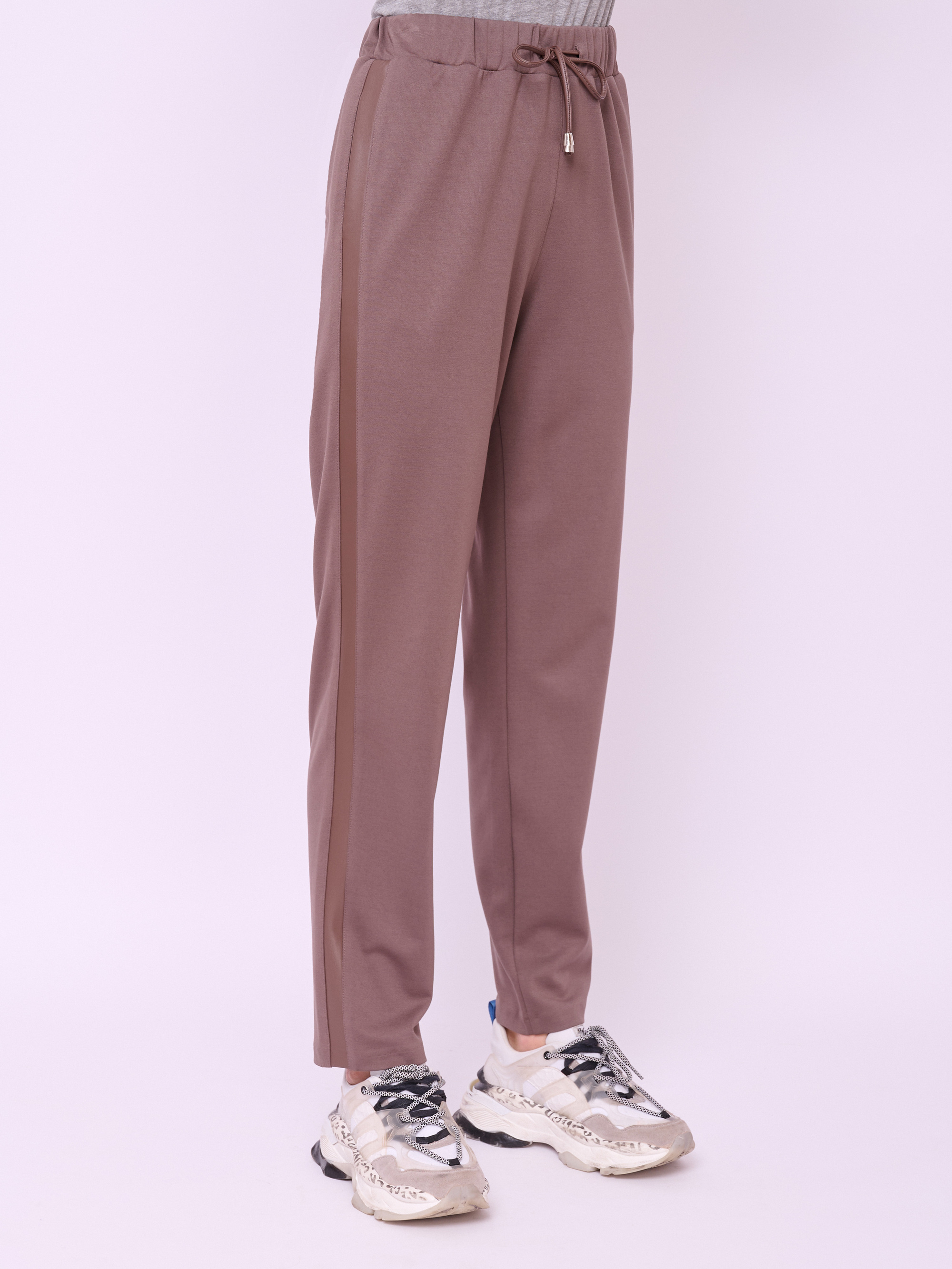 Трикотажные зауженные комфортные брюки на резинке и кулиске с косыми карманами и лампасами из искусственной кожи. Длина брючин: 79 см.