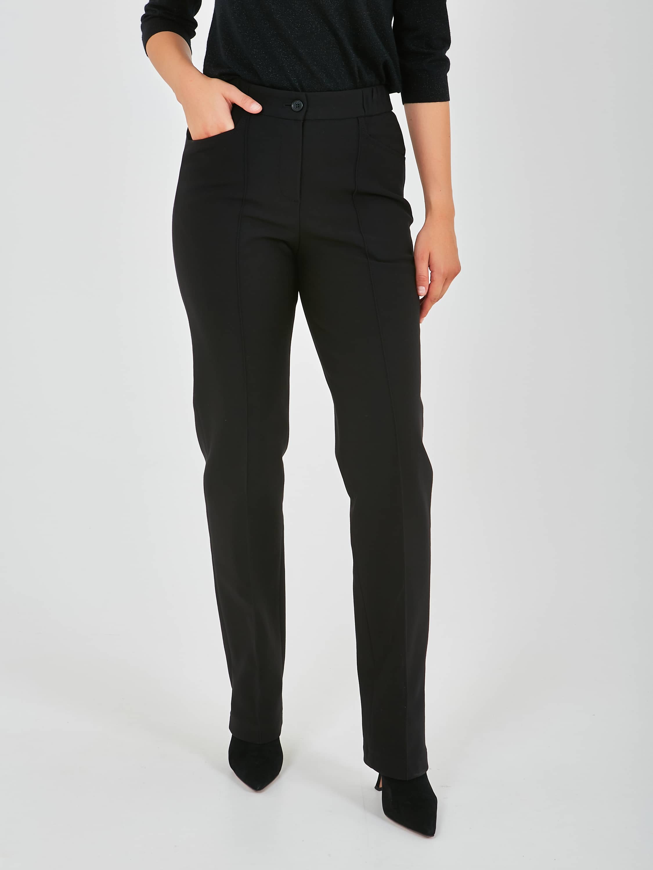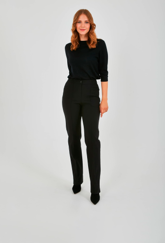 Длинные прямые брюки, с застежкой на молнию и одну пуговицу. Брюки, слегка зауженные книзу. На передних половинках расположены два кармана с отрезным бочком, а также декоративные швы, имитирующие стрелки, по всей длине брючины. Верх брюк обработан поясом на резинке.