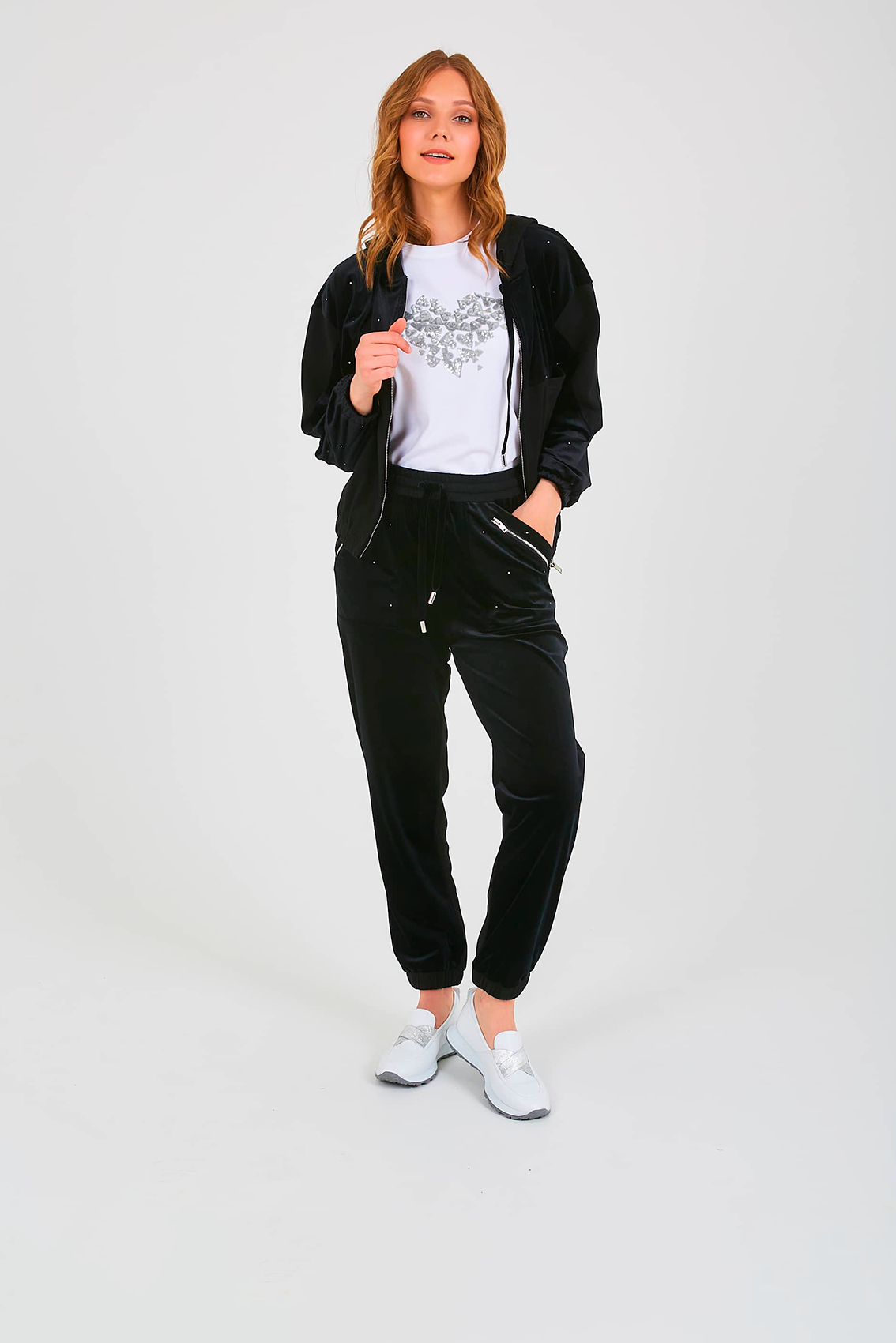 Спортивные брюки с завышенной талией длиной до щиколотки без застежки, дизайнерская особенность – использование двух разных по фактуре материалов, один из которых создает имитацию «звездного неба». На передних половинках расположены два кармана с отрезным бочком – имитация накладных карманов и декоративными молниями. На задних половинках брюк расположены карманы с листочкой. Верх брюк обработан поясом на резинке со шнуром для регулировки объема и металлическими наконечниками. Низ брюк присборен на манжету.
