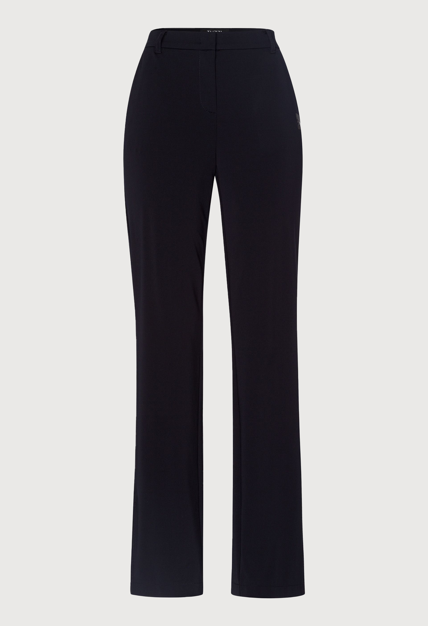 Брюки женские с декоративным прорезным карманом сзади. Прямые брючины облегают фигуру, эластичный трикотаж, за которым легко ухаживать, имеет струящуюся драпировку и мягкий на ощупь. Вневременной однотонный образ дополнен изящным принтом на левом кармане брюк