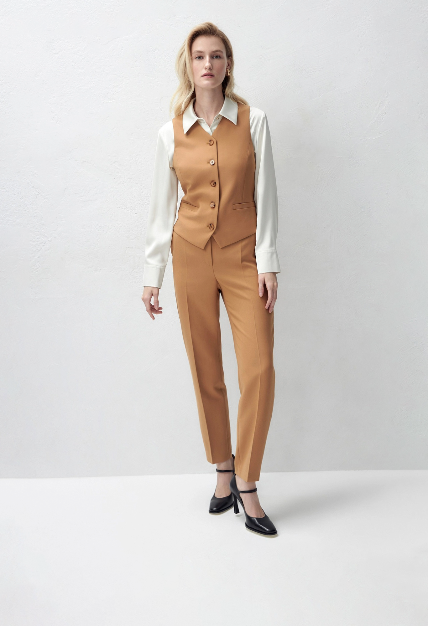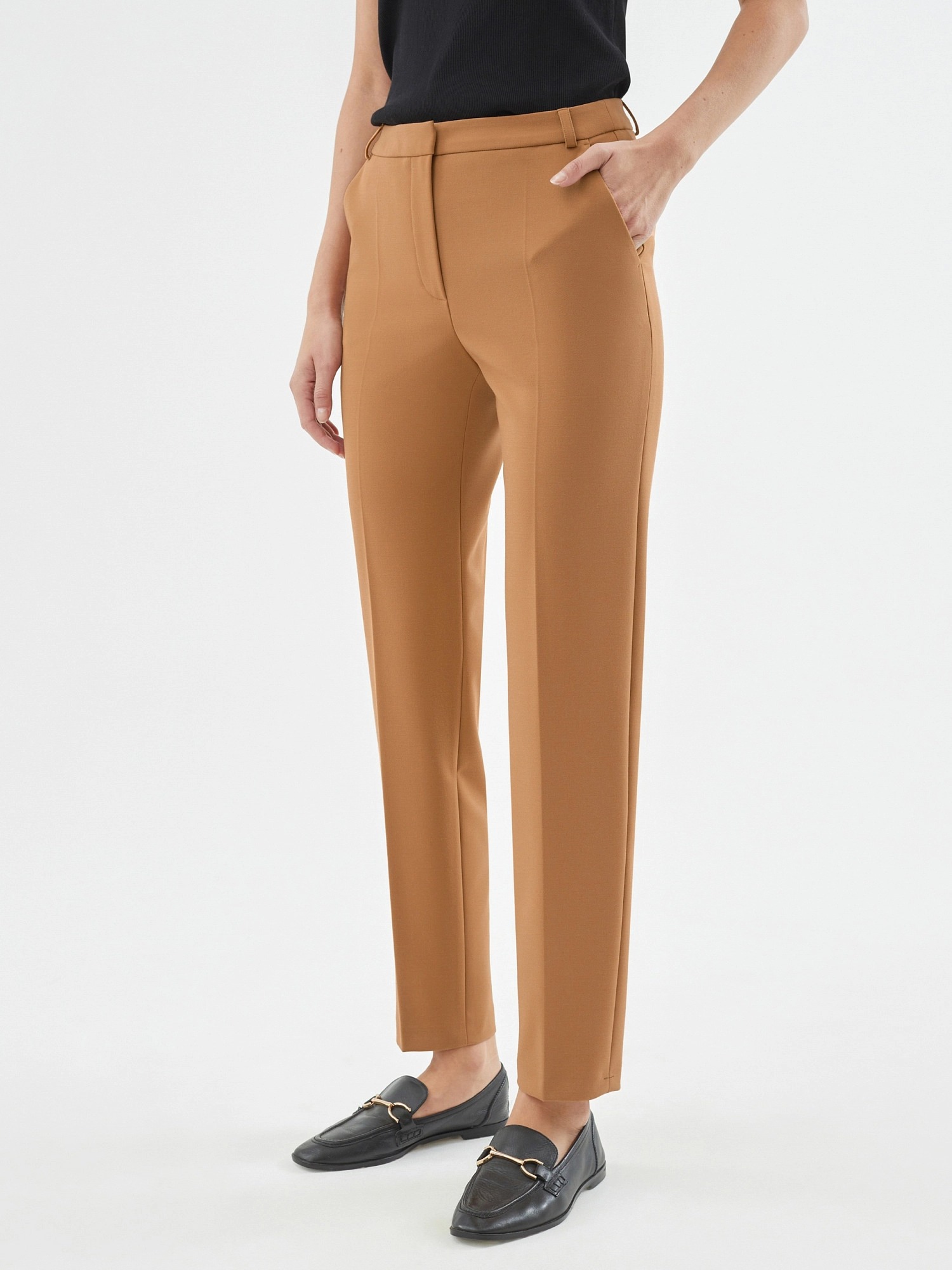 Брюки со стрелками из костюмной ткани зауженного к низу силуэта на притачном поясе со шлевками. Спереди рабочие боковые карманы и застежка на молнию и крючок.