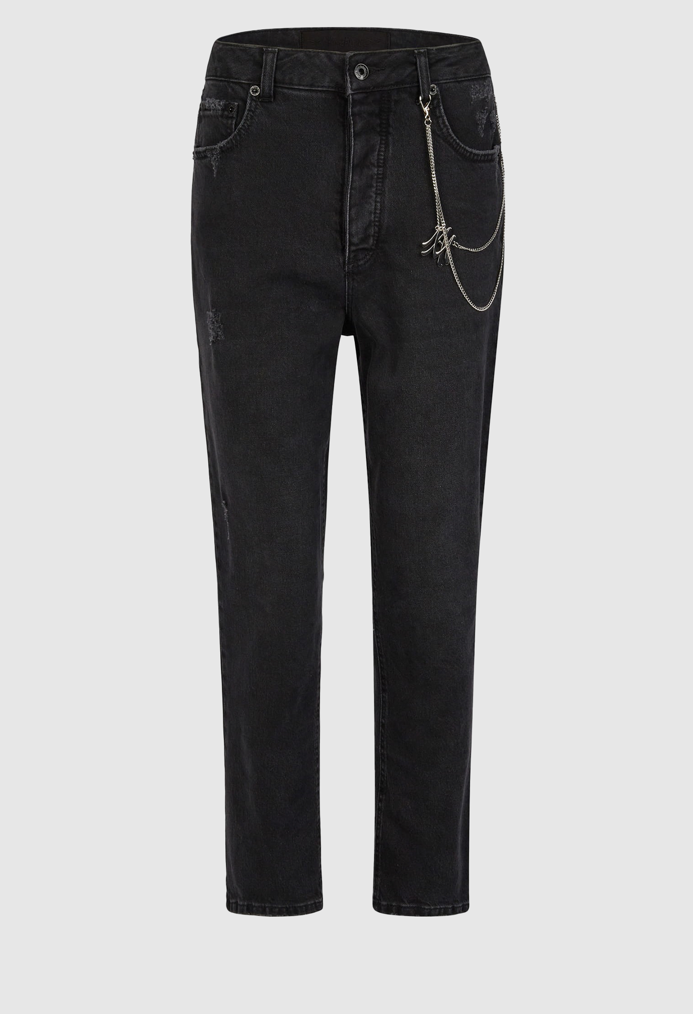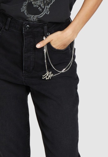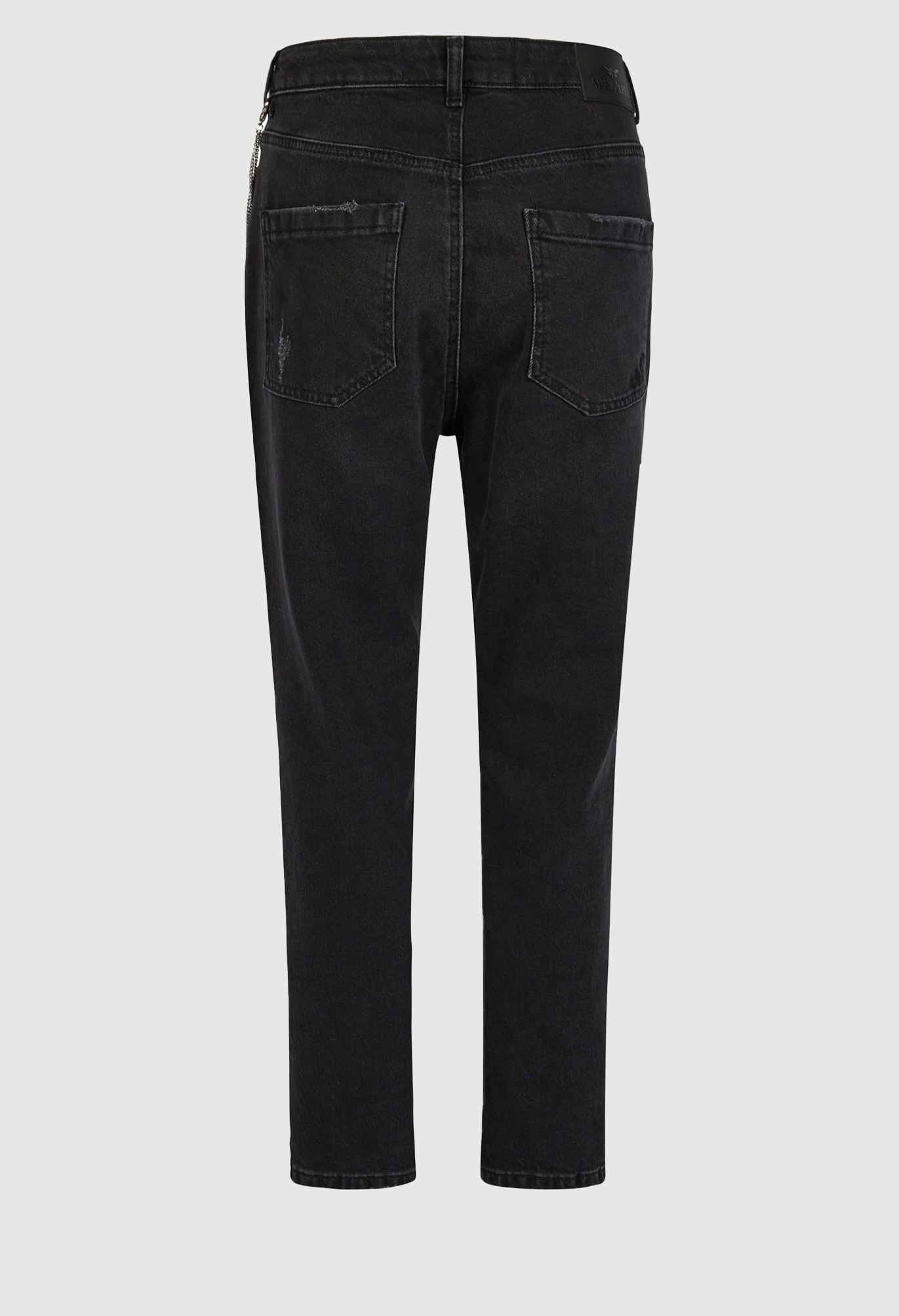 Укороченные джинсы Mom с высокой талией из комфортного черного денима. Эластичный материал не только придает им элегантный вид, но и делает их чрезвычайно удобными в ношении. Модный свободный крой с завышенной талией и укороченной длиной промежности создает вау-эффект, как и съемная ювелирная цепочка серебристого цвета с логотипом.