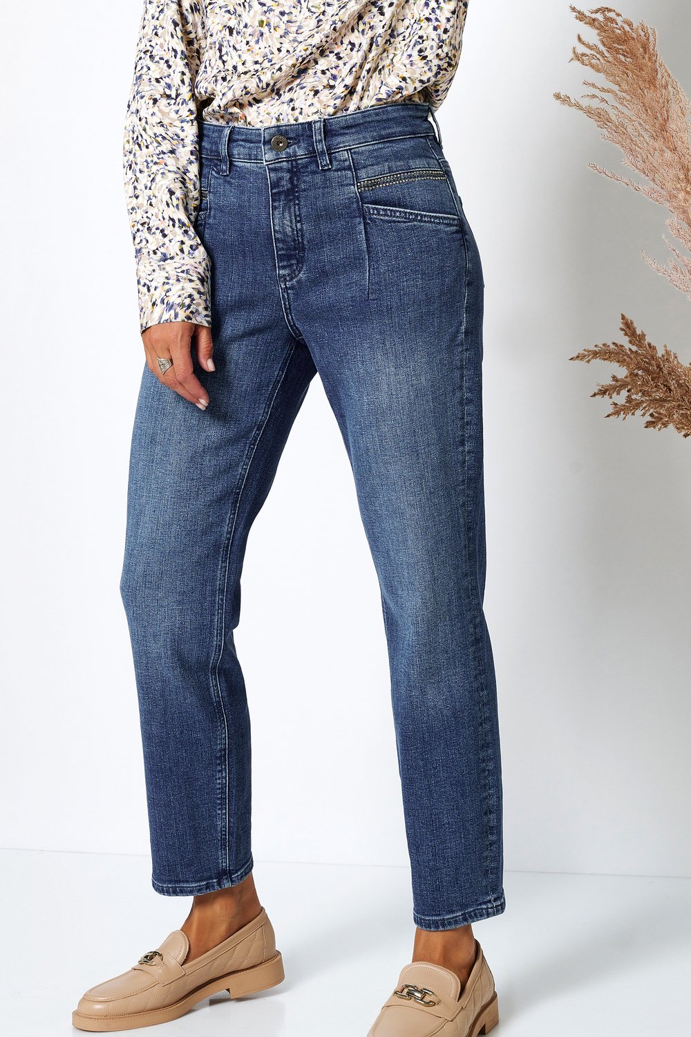 Джинсы прямого кроя с металлическими пластинами и вытачками в качестве деталей из стираного денима, слегка укороченной длины.