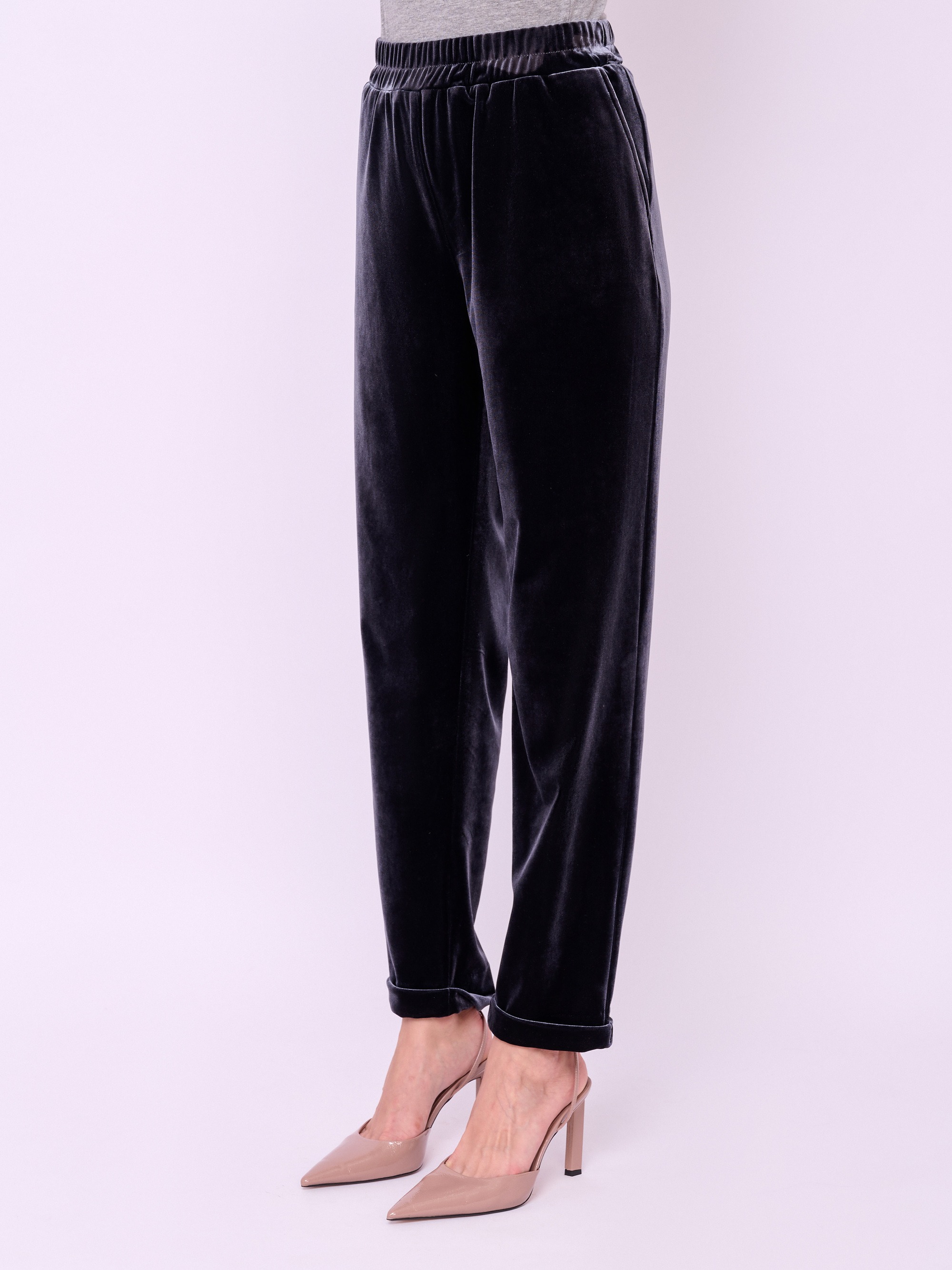 Трикотажные зауженные бархатные брюки на резинке с косыми карманами и отворотами по низу брючин. Длина брючин: 74 см.