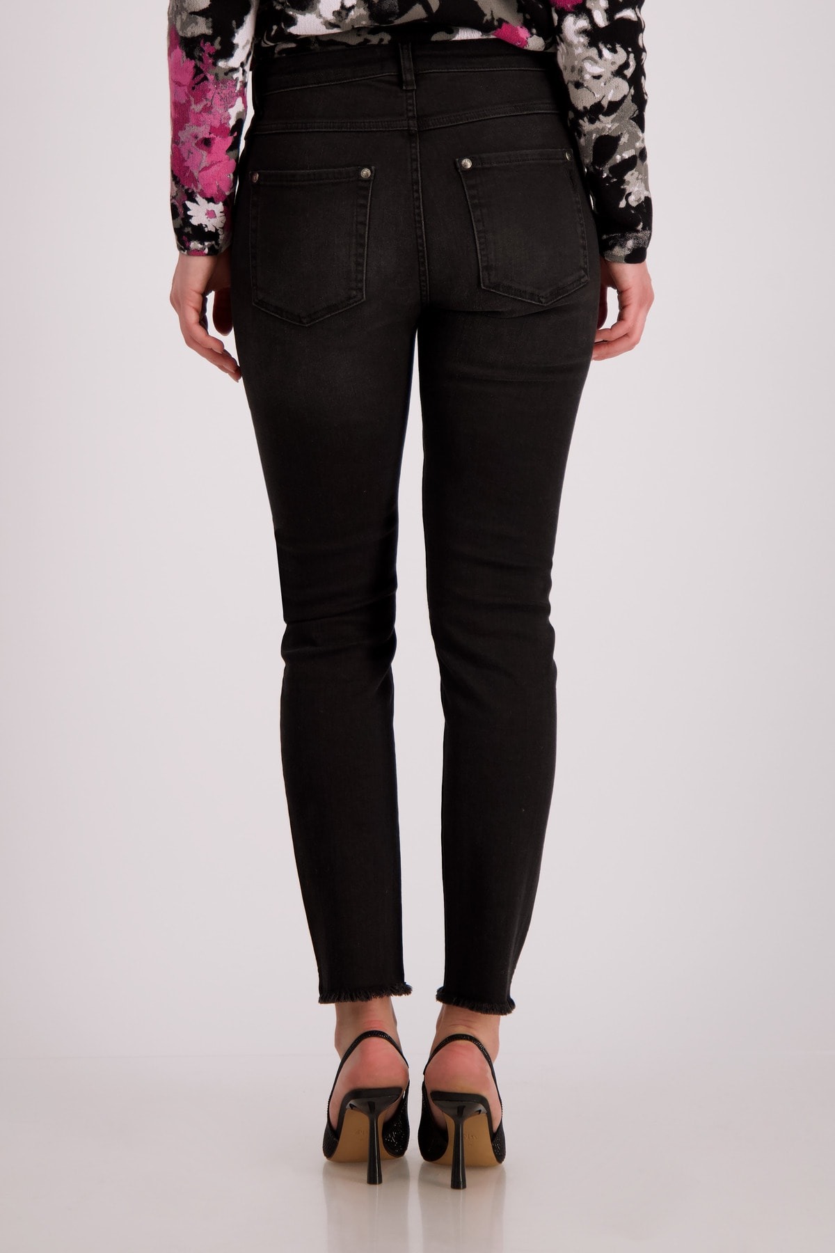 Джинсы приталенного кроя из эластичной смеси хлопка с максимальным комфортом. Боковины с тонированными заклепками. Бахрома на манжетах штанин. Тонкая посадка. Нормальная высота талии. 5-карманный стиль. Длина внутренней штанины для всех размеров составляет 74 см.