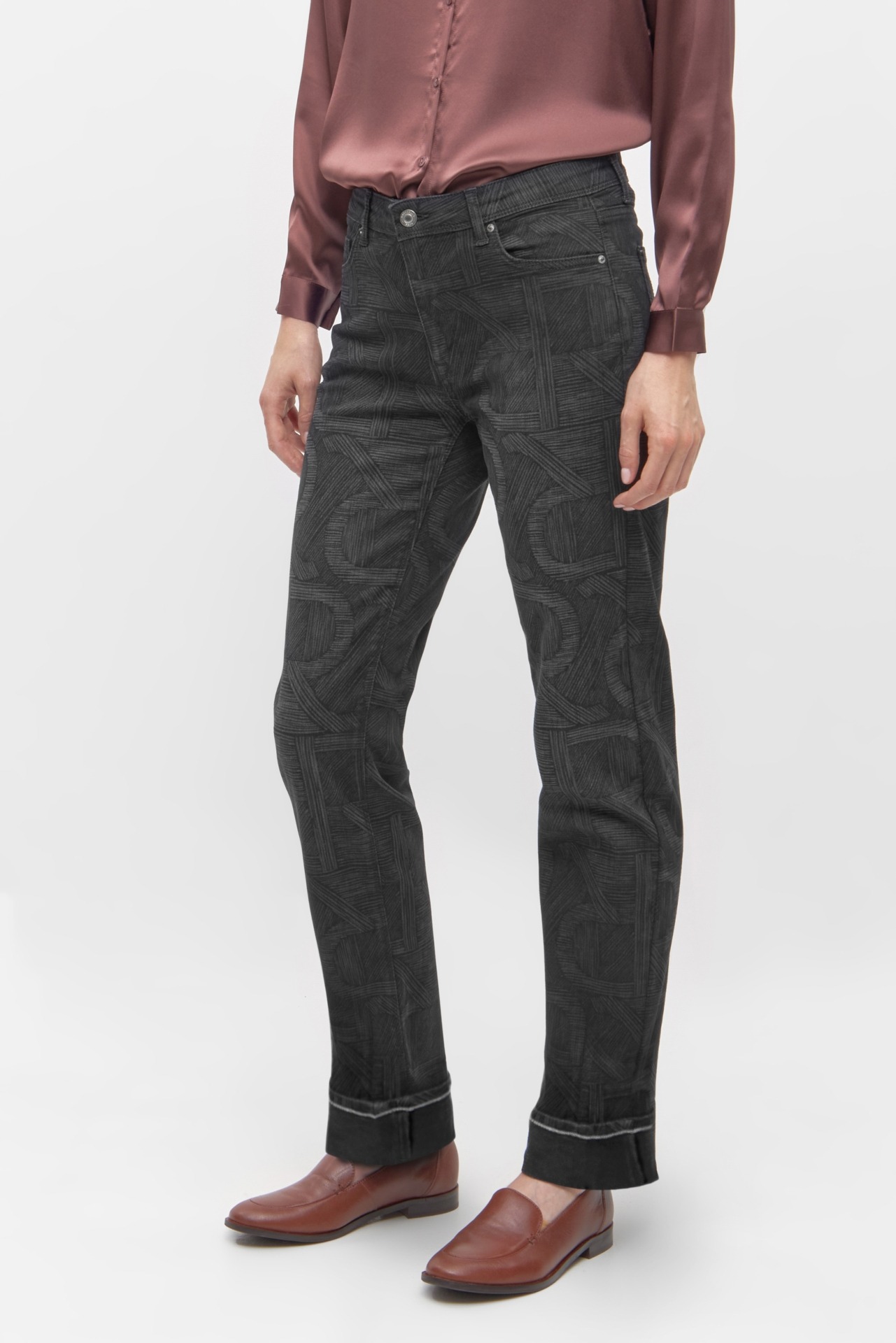 Джинсы со средней посадкой и пятью карманами и изысканным логотипом RR по всей поверхности. Свободная прямая модель. Длина по внутреннему шву: 74 см.