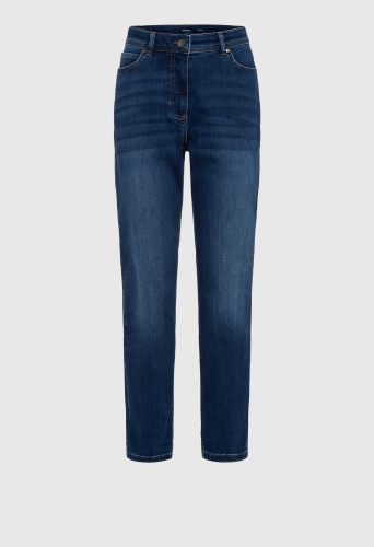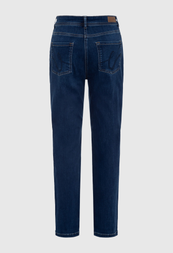 Джинсы из темного денима с легким эффектом стирки имеют классический джинсовый дизайн с пятью карманами и вышитыми задними карманами. Они сидят прямо на естественной линии талии, удлиняя ноги и обеспечивая свободную посадку в области бедер.