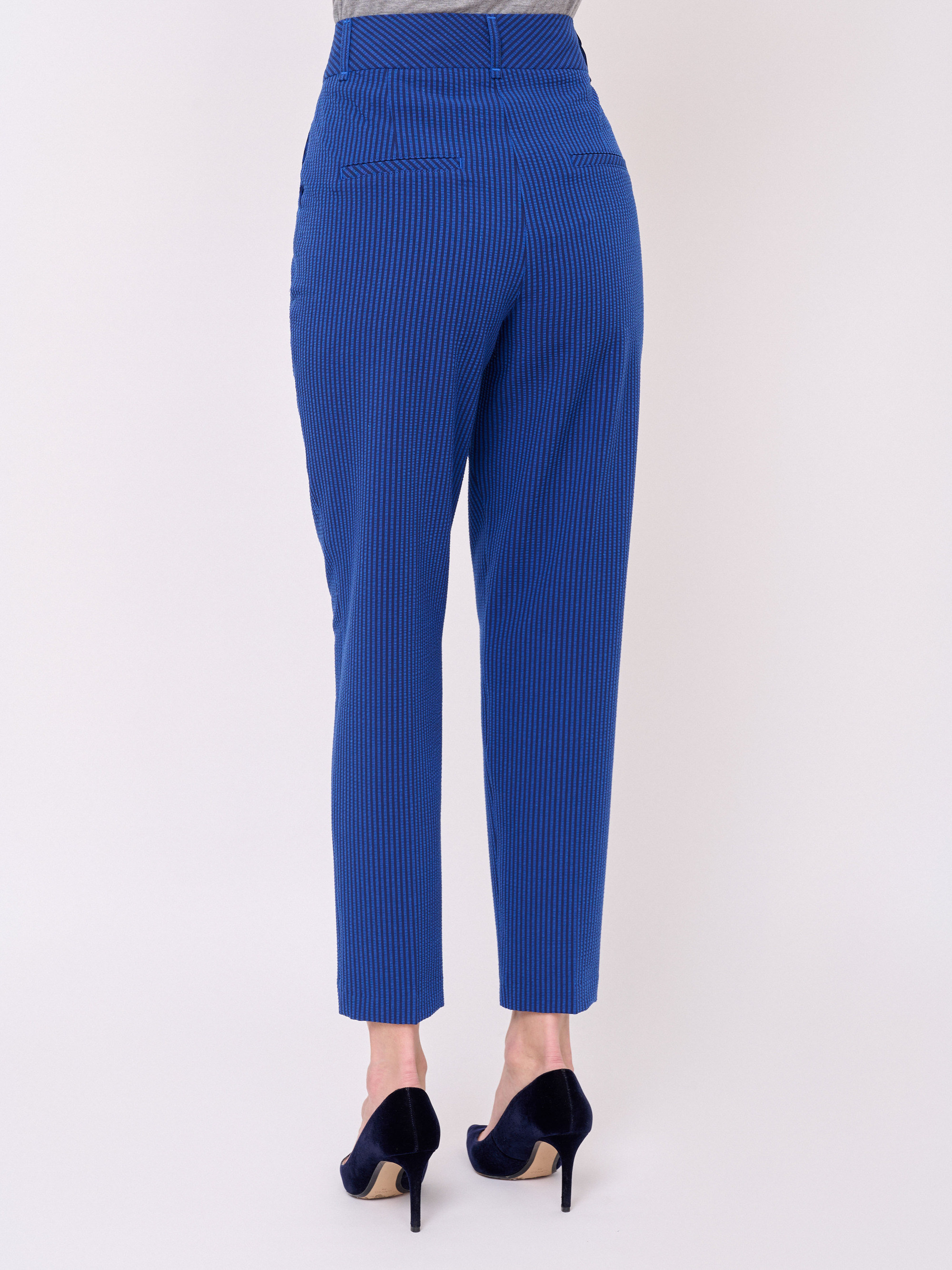 Жатая ткань, застежка молния, рисунок полоска, карманы косые, крой брючин зауженный, посадка средняя, шлевки для ремня. Длина брючин: 75 см.