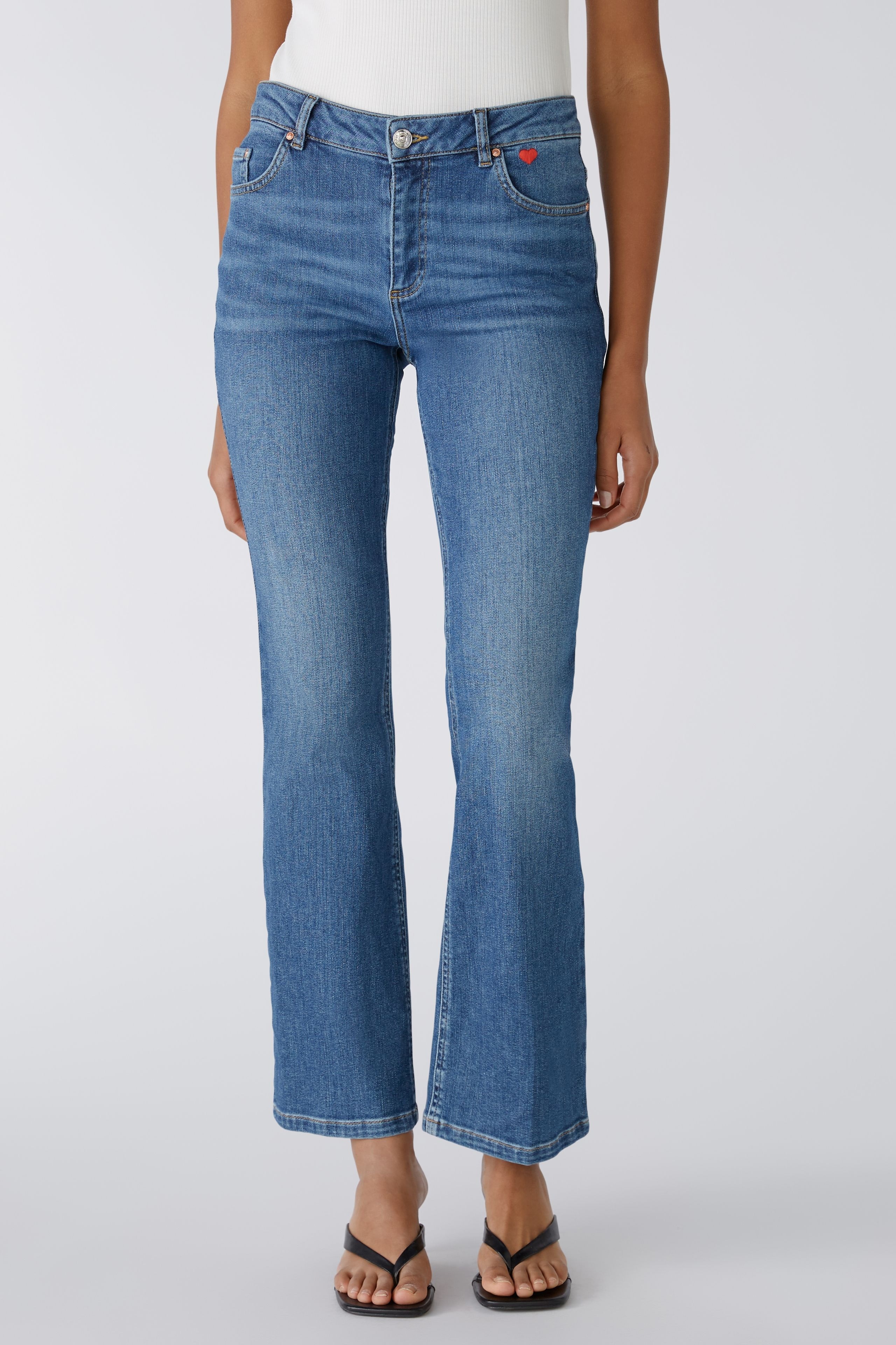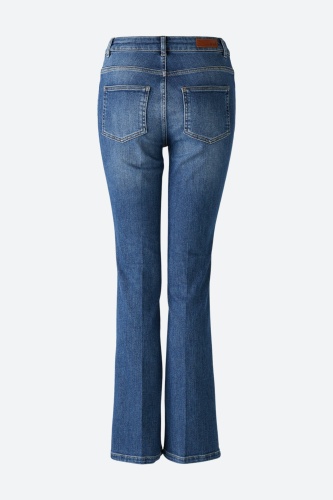 Эластичная смесь хлопка, аутентичная стирка среднего синего цвета. Средняя талия, стандартная длина, модный расклешенный крой. С молнией и пуговицей с логотипом, петлями для ремня. Типичные сумки с пятью карманами. Любимая деталь: маленькая вышивка в виде сердечек на сумке. Эластомультиэстер с превосходными свойствами растяжения и отскока. Длина для размера 36: 80 см.