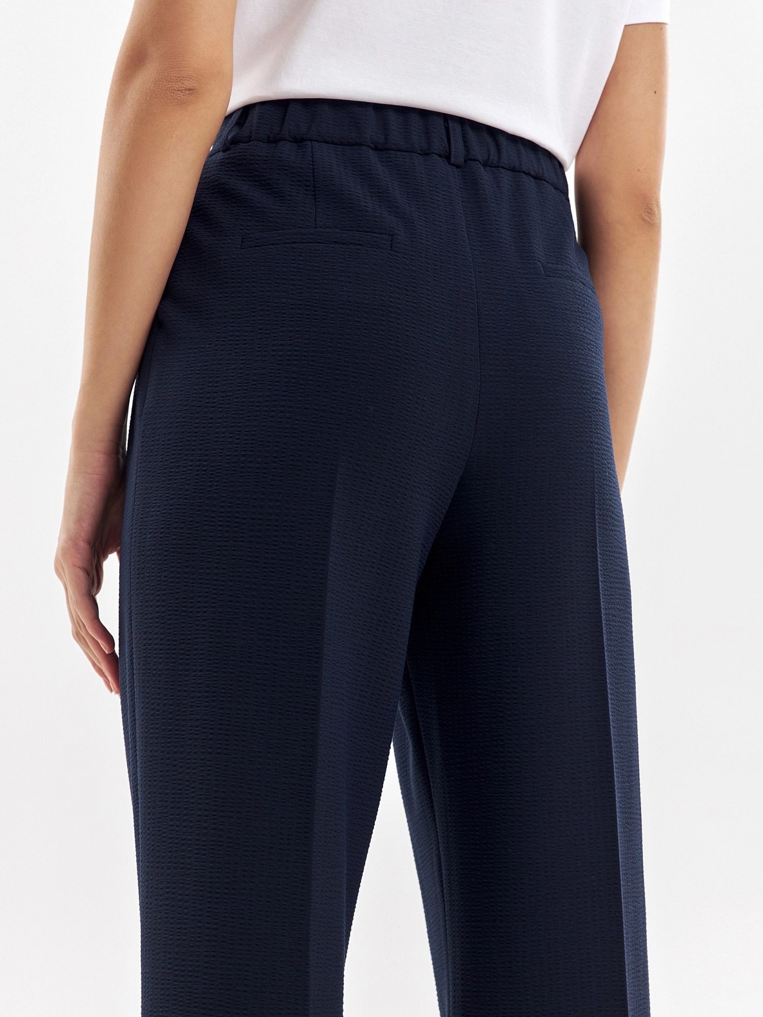 Стильные широкие брюки прямого силуэта из фактурной вискозной ткани темно-синего цвета, на притачном поясе с резинкой на спинке и шлевками. Застежка спереди на молнию, пуговицу и крючок. Карманы рабочие в боковых швах.