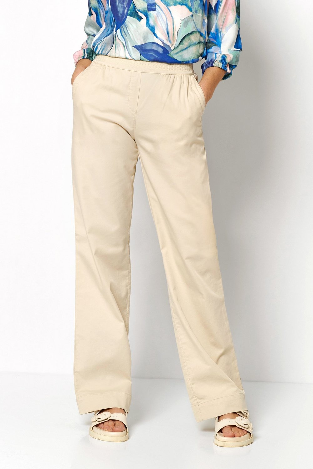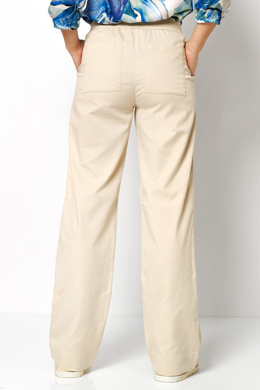 Широкие штанины из особо легкой смеси хлопка, с эластичной резинкой и широкими штанинами. Длина брюк в 44 размере - 82 см.