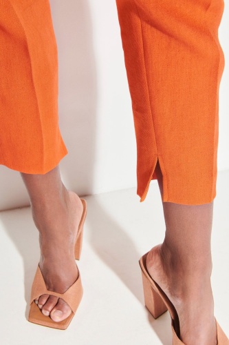 Слегка укороченные брюки из тонкой струящейся смесовой льняной ткани с узкими зауженными брючинами и приглаженными складками. Брюки имеют боковой разрез по низу, два боковых кармана и два декоративных набедренных кармана с клапанами.