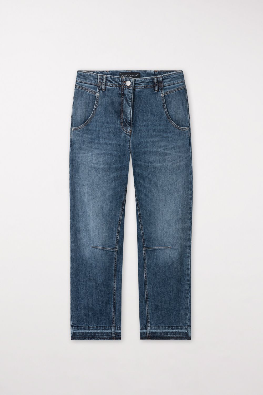 Укороченные джинсы свободного кроя из настоящего эластичного денима с оттенком синего цвета и винтажными эффектами. Слегка изогнутая форма штанин, разделительные швы на высоте колена и открытые края также характеризуют дизайн. Брюки очень удобны в носке благодаря использованию специальной эластомультиэфирной пряжи.