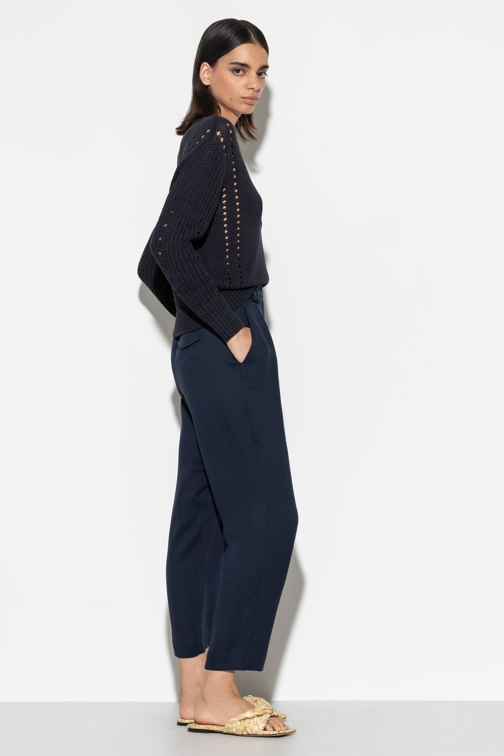 Укороченные брюки слегка зауженного силуэта из мягко струящегося габардина. Особенности включают складки, двойные петли для ремня, боковые карманы и декоративные задние карманы с клапанами.