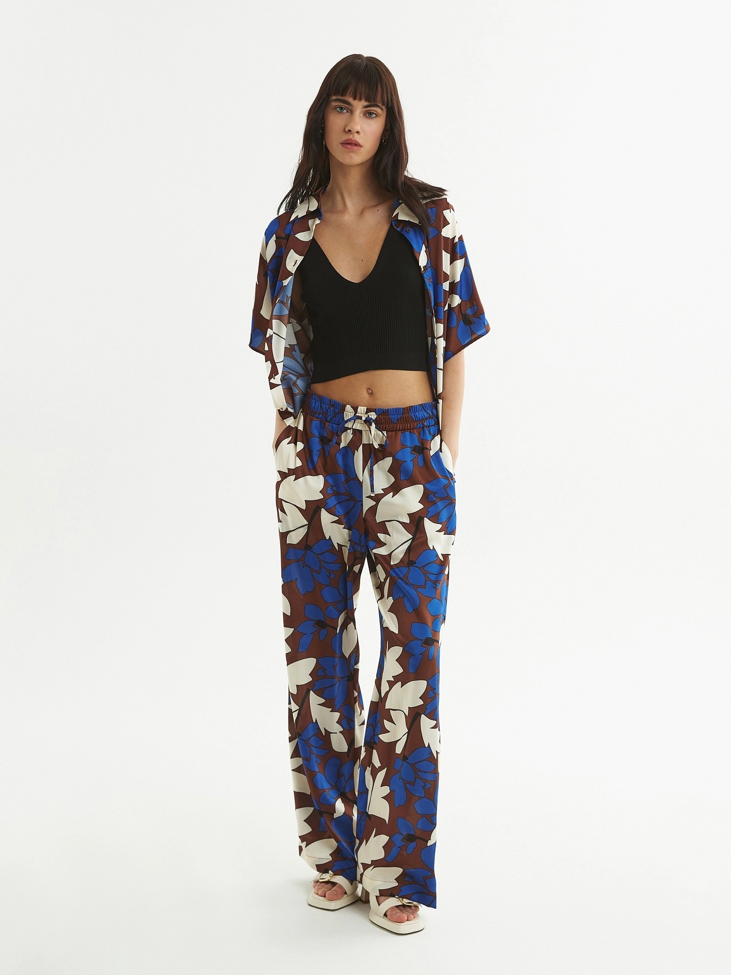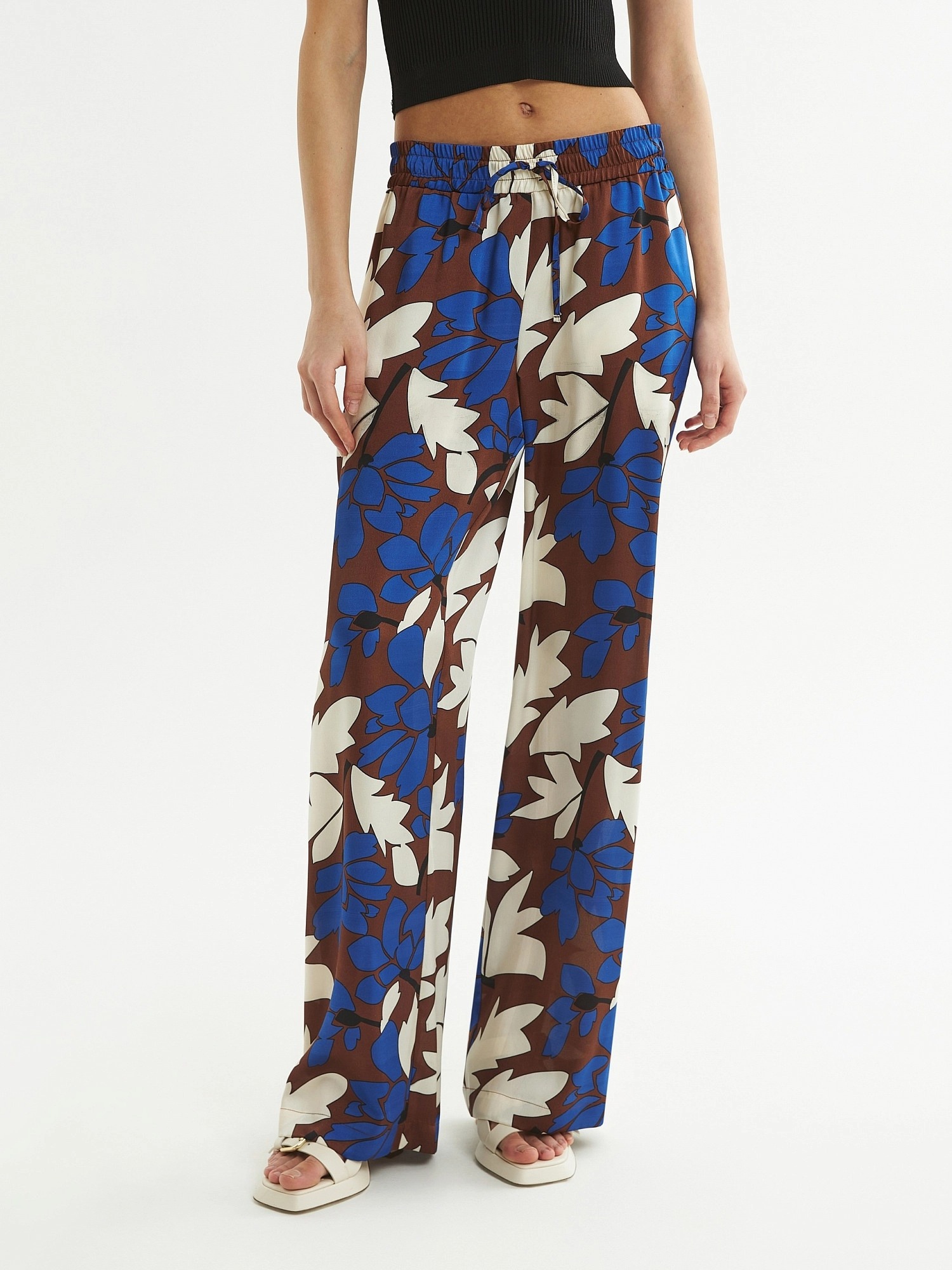 Брюки полной длины, из плательной ткани с крупным цветочным притом, свободной формы, на поясе. В пояс вставлена резинка и кулиcка для лучшей фиксации.
