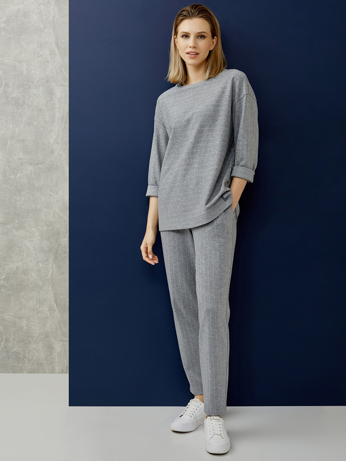 Однотонные серые брюки прямого кроя в полоску. Эластичный пояс с кулиской обеспечивают комфортную посадку и удобство ношения. Брюки – идеальный вариант низа для повседневного образа, сочетаются как с футболкой или джемпером, так и с жакетом в тон.