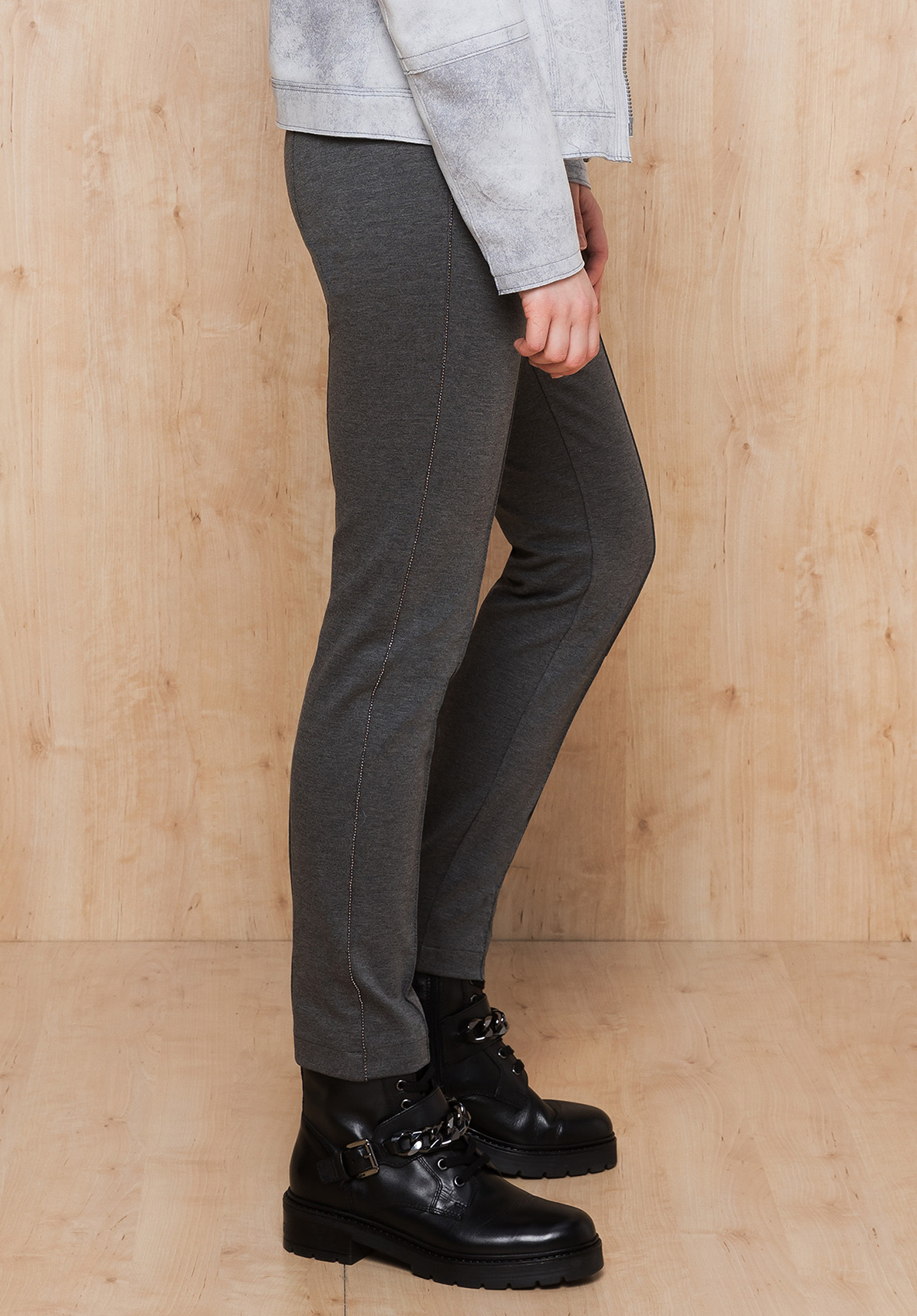 Стильные и суперкомфортные джеггинсы средней посадки. Эта модель привлекает своим мягким эластичным вискозным материалом и модными деталями. Блестящая тесьма сбоку придает модели элегантность. Эластичный пояс позволяет легко надеть брюки и обеспечивает удобство в ношении.