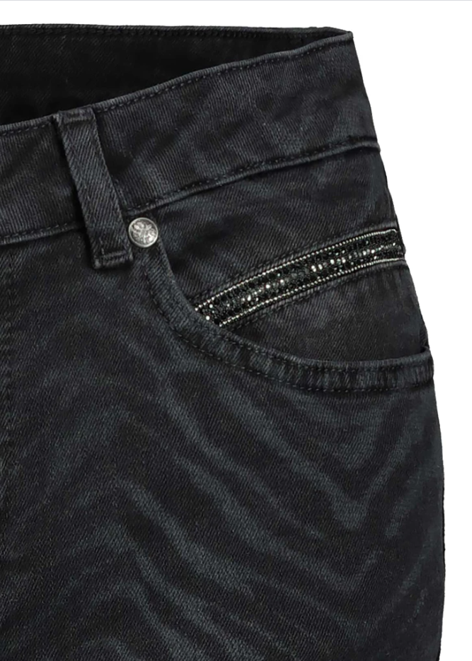 Зауженные джинсы в анималистичном дизайне. Принт зебра по всей поверхности. Передние прорезные карманы украшены декоративной лентой. Накладные задние карманы. Брюки застегиваются на пуговицу и потайную молнию.