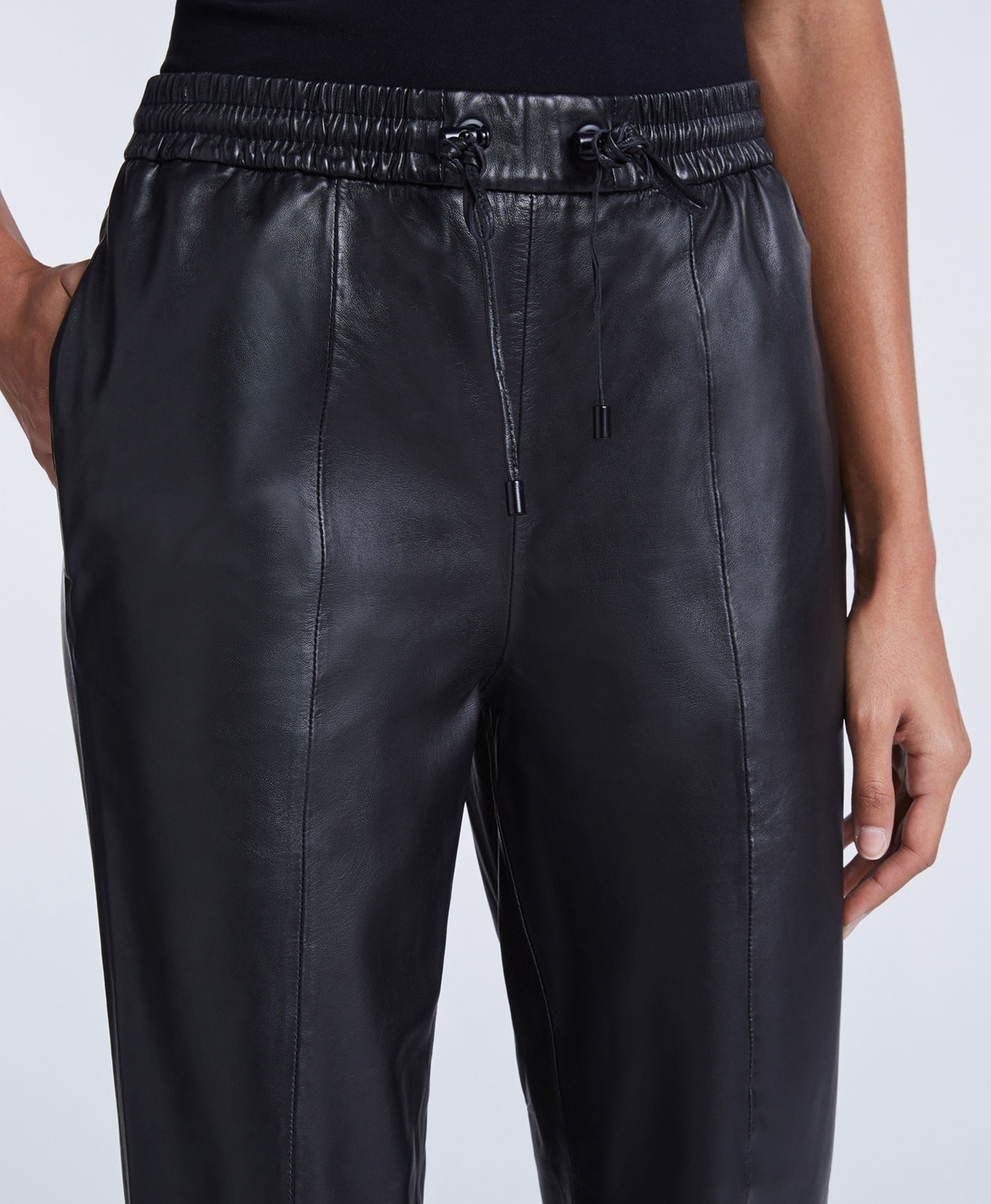 Укороченные брюки из экокожи в спортивном стиле. Эластичный пояс с кулиской обеспечивает комфортную посадку. Прорезные боковые карманы и накладные задние карманы. Шов спереди на штанинах.