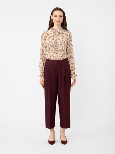 Брюки свободного кроя, длина 7/8. Высокая посадка. Спереди глубокие складки. Застежка на молнию и крючок. Боковые карманы рабочие.