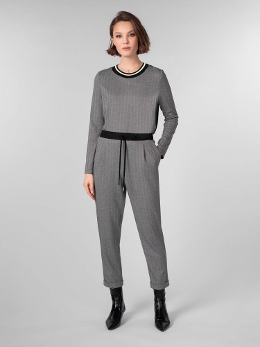 Брюки из трикотажного полотна зауженного к низу силуэта на притачном поясе с кулиской и завязками. Спереди боковые карманы, по низу брюк манжеты. Сзади карманы листочки.