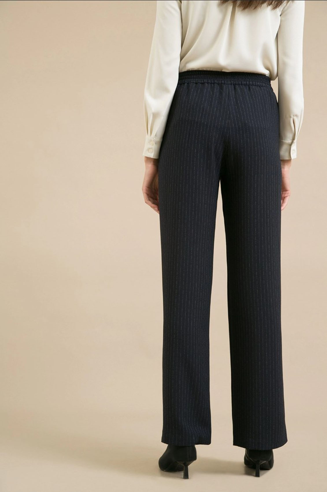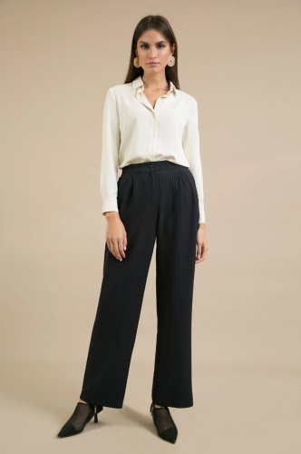 Темно-синие брюки в полоску. Модель свободного кроя, имеет высокую посадку, притачной пояс, боковые вертикальные карманы. Спереди расположен гульфик классической формы, застегивается на потайную молнию и пуговицу. У карманов штанины драпированы складками. Элегантная модель для создания делового образа.