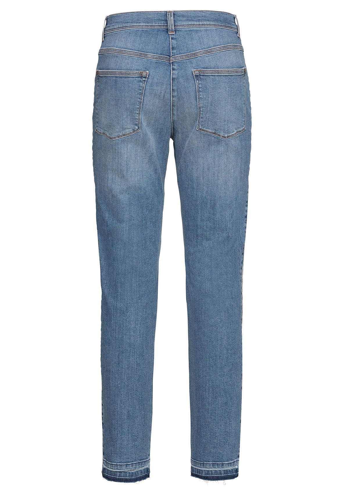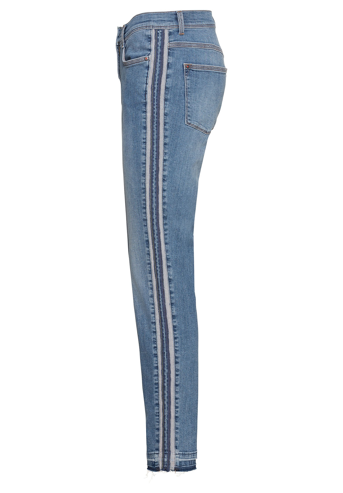 Данная модель джинсов создает оптимальную посадку благодаря прилеганию по линии ног. Модные потертости, полосы по бокам в спортивном стиле. Открытый нижний срез с бахромой придает брюкам демократичный вид. Неважно, спортивный или шикарный образ вы создаете, эти джинсы станут вашей модной изюминкой сезона. • джинсы с эффектом потертости и бахромой по низу • эластичная хлопковая джинсовая ткань • 5 карманов • яркие полосы по бокам • силуэт slim, средняя посадка • длина около 74 см