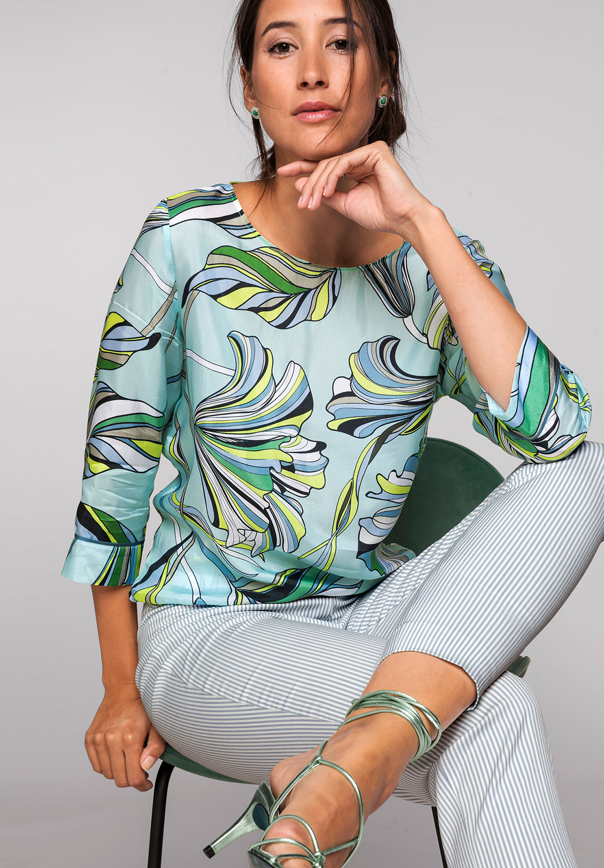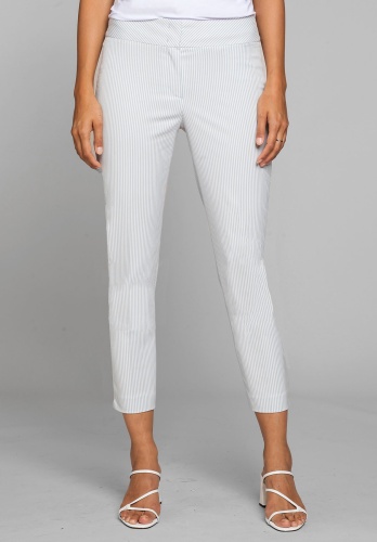 Эластичные брюки Siena с трендовым принтом в полоску. Брюки отлично подходят для стильного образа. Эластичный материал очень удобен в ношении. Данная модель имеет силуэт slim, среднюю посадку, длину 7/8, высокий пояс со скрытой застежкой и небольшой карман под поясом. Брюки станут идеальной модной парой как для делового, так и для повседневного образа. • брюки с принтом в полоску • высококачественная смесь вискозы и эластана • застежка-молния, небольшие разрезы по бокам • средняя посадка, силуэт slim • укороченные брюки 7/8, длина около 68 см
