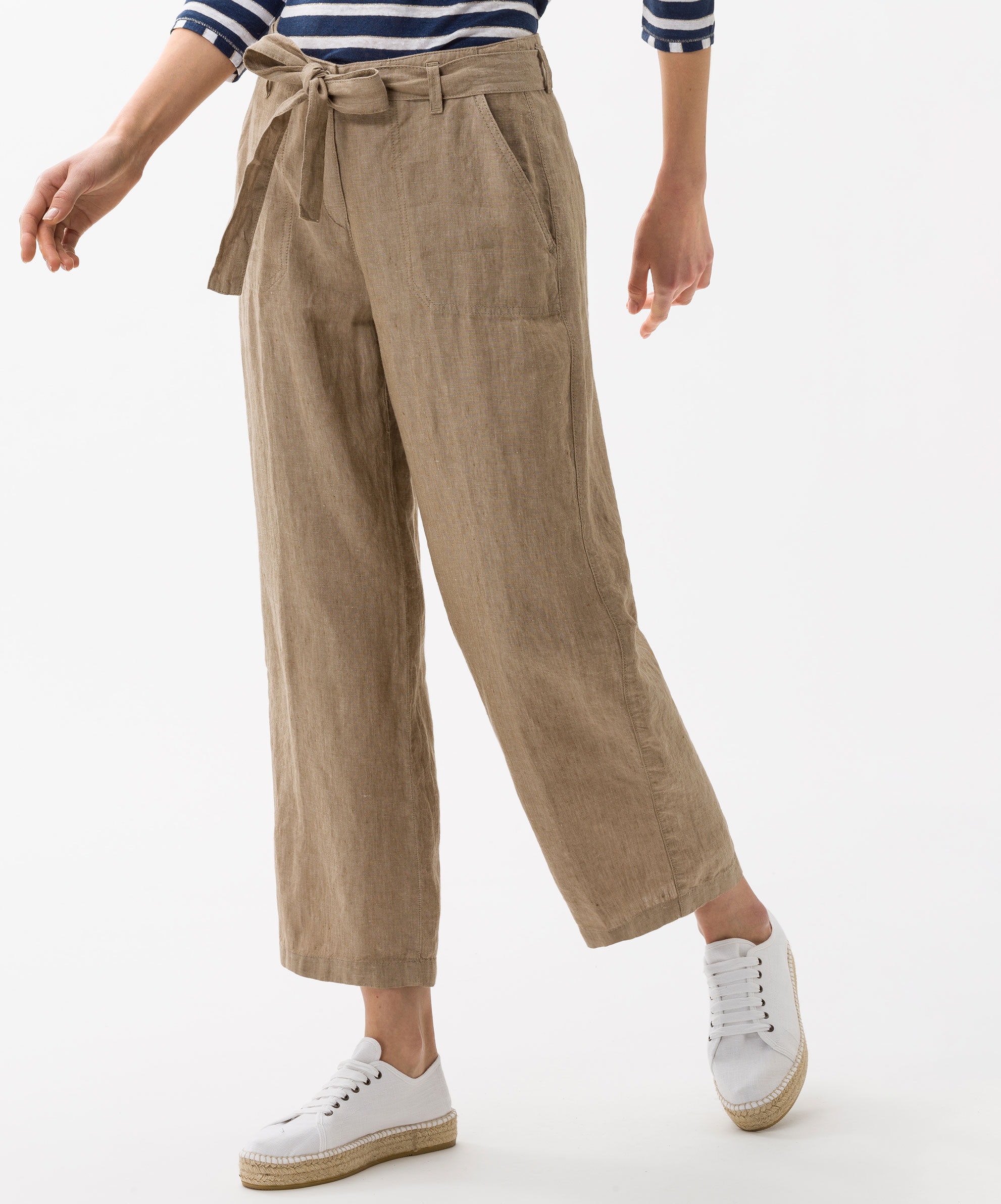 Укороченные брюки свободного силуэта выполнены из 100%-го льна. Комфортная высокая посадка. В комплекте идет пояс из основного материалв изделия. Врезные карманы с листочками сзади. Брюки идеально подойдут для жаркой летней погоды, обеспечат комфортную терморегуляцию.