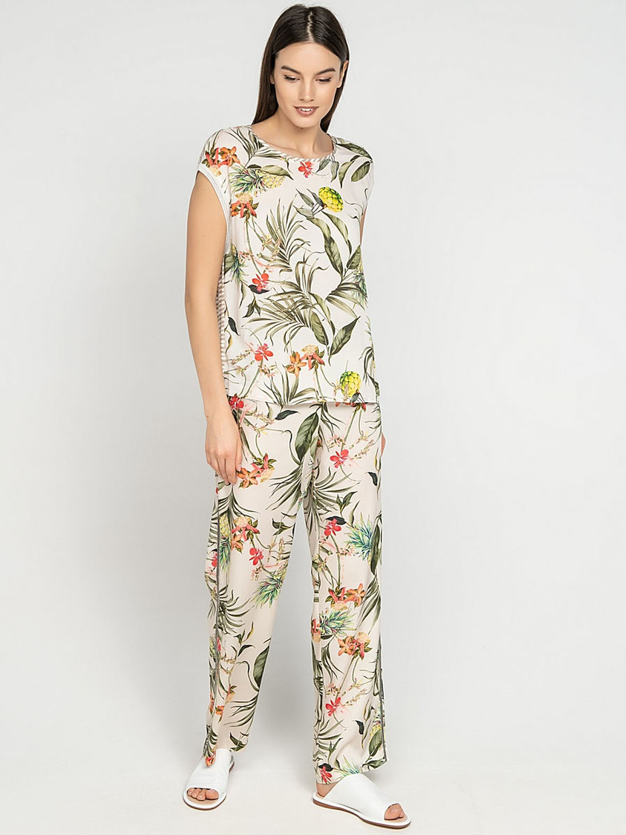 Широкие прямые брюки с трендовым тропическим принтом. Модный свободный силуэт. Эластичная лента на поясе. Без карманов. Декоративная лента по бокам. Приятный к телу материал из смеси хлопка и эластана.