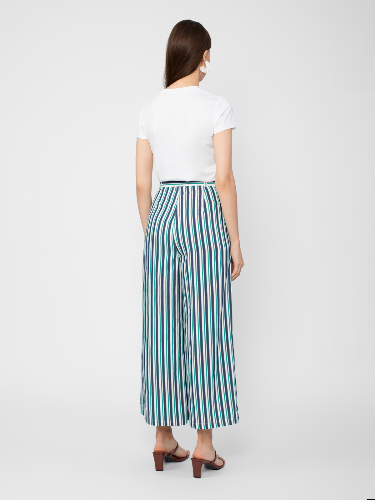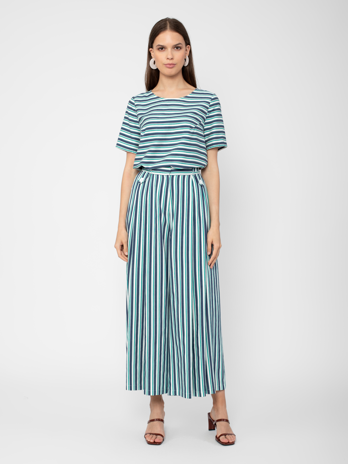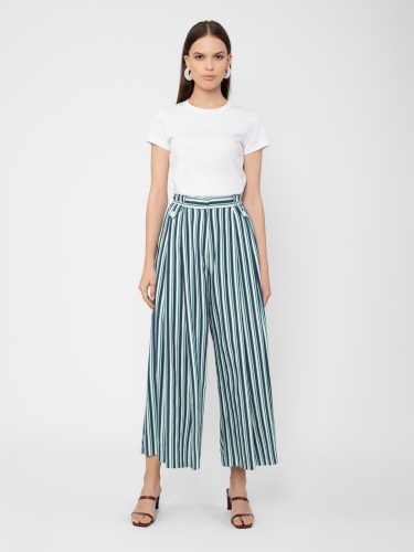 Брюки в полоску прямого широкого силуэта на притачном поясе с широкими шлевками и с боковыми карманами. Застежка спереди на молнию.