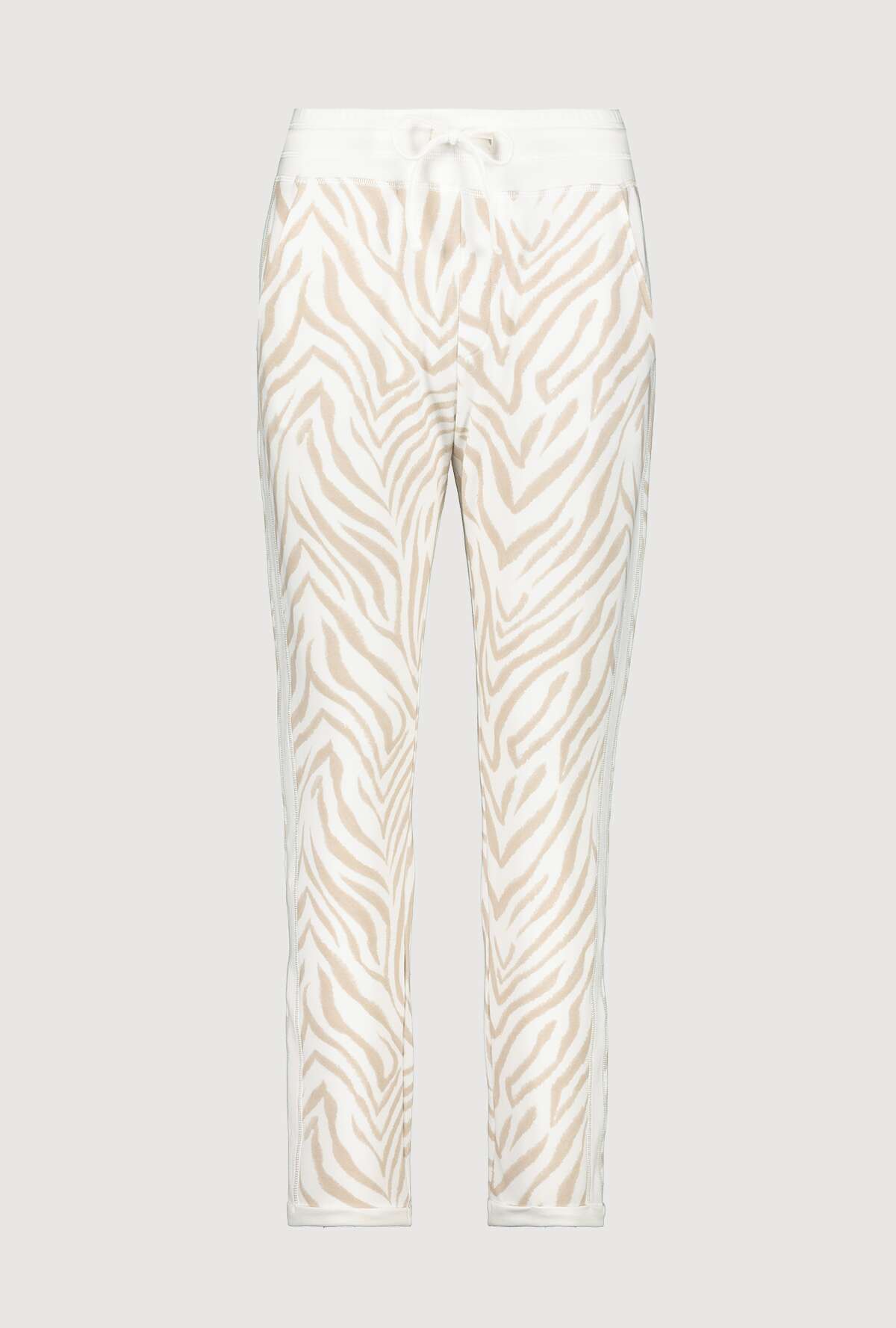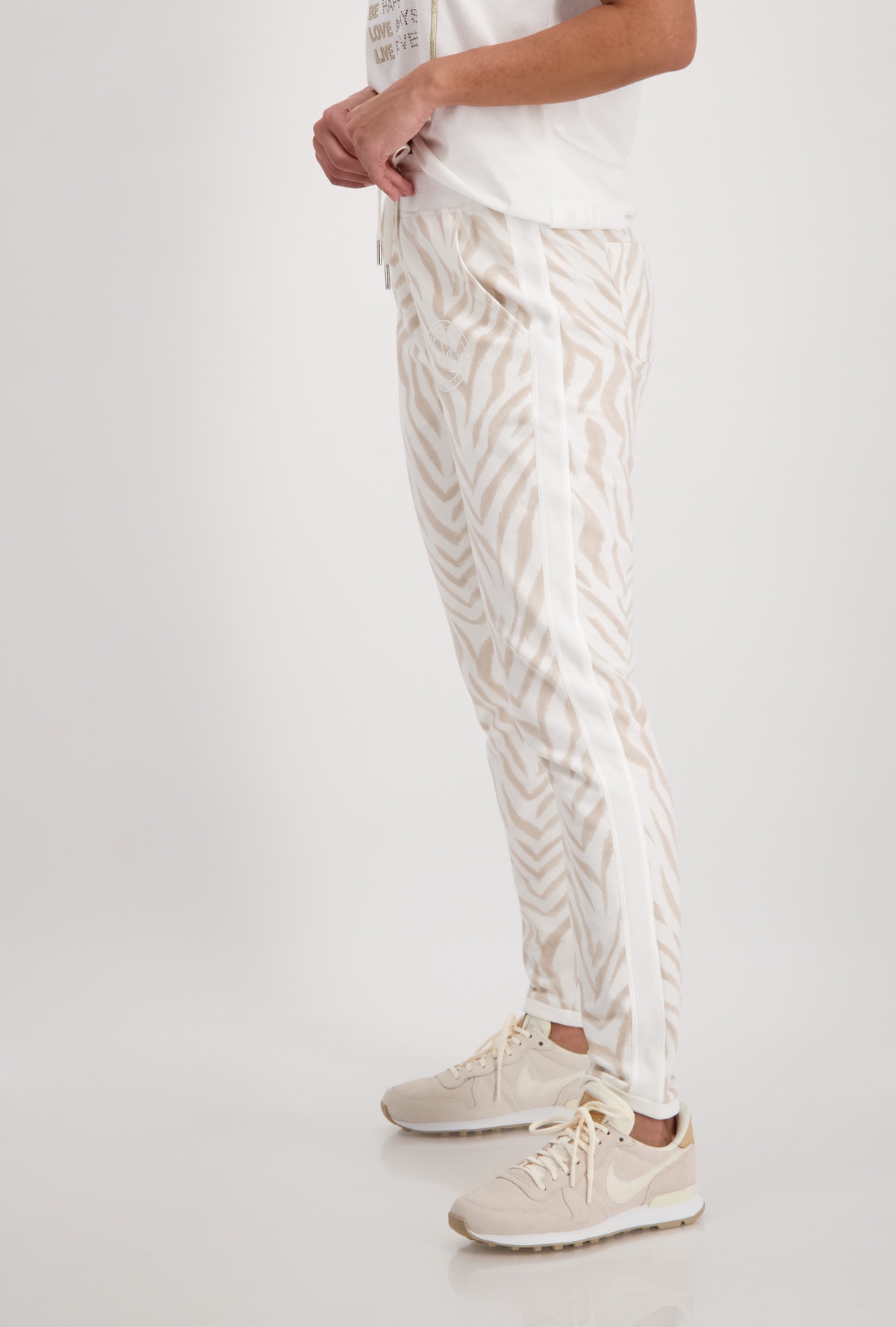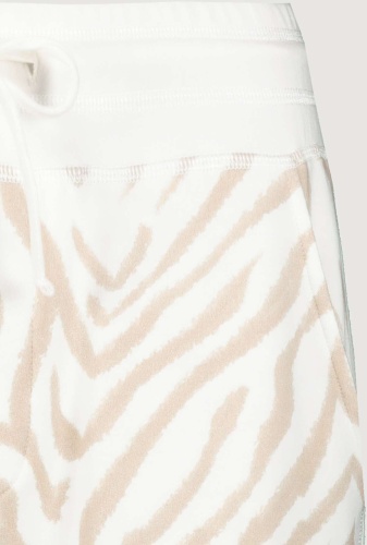 На сайте указаны Российские размеры. Спортивные джоггеры Monari с животным принтом. Сплошной рисунок под зебру дополняется однотонным поясом с блестящими оверлочными швами, однотонной тканевой вставкой с блестящими оверлочными швами по бокам и подвернутыми однотонными штанинами. Боковые карманы и накладные карманы на ягодицах завершают вид спортивных штанов с нормальной посадкой. Параметры модели: 42 размер, рост 179 см