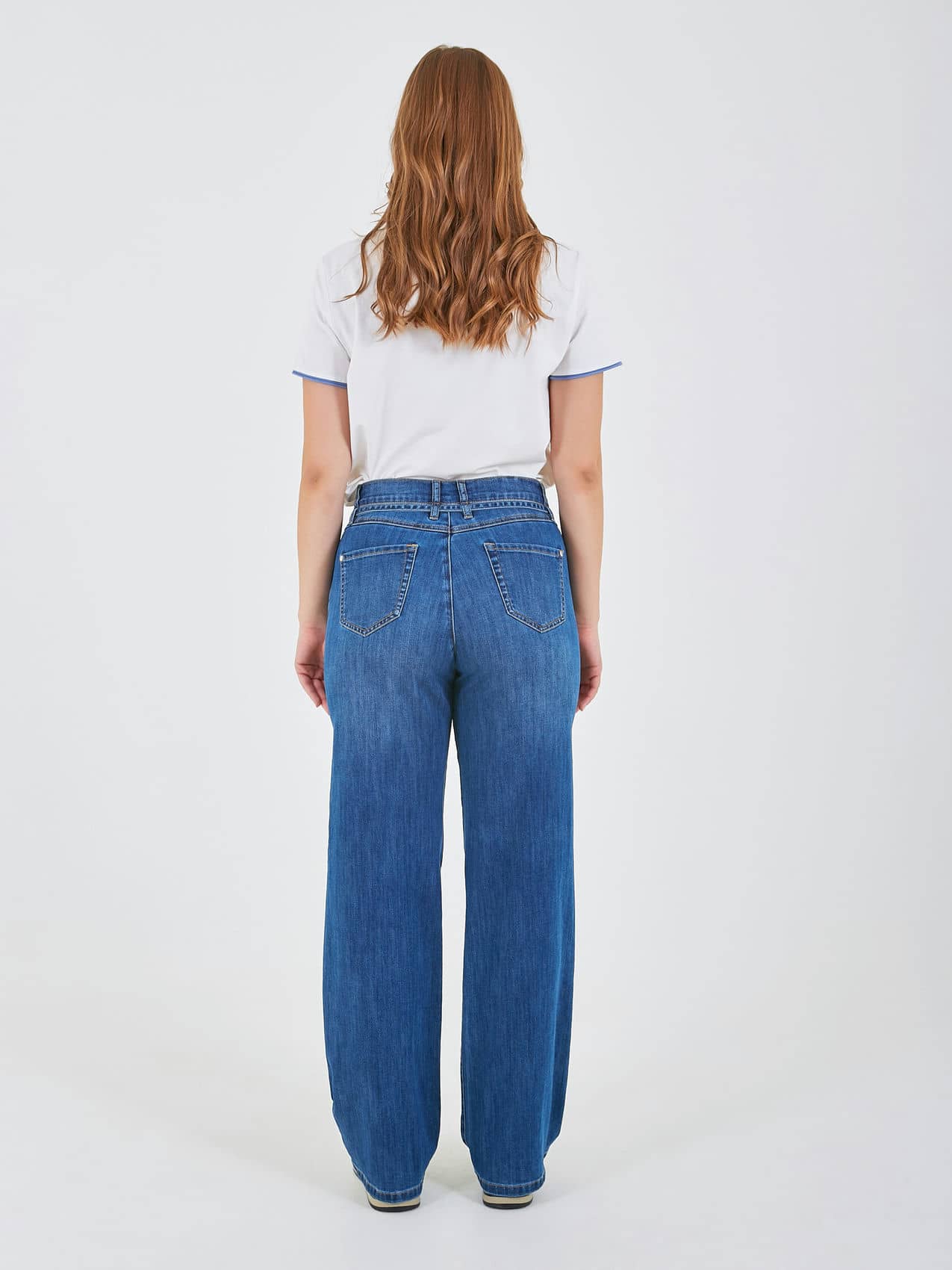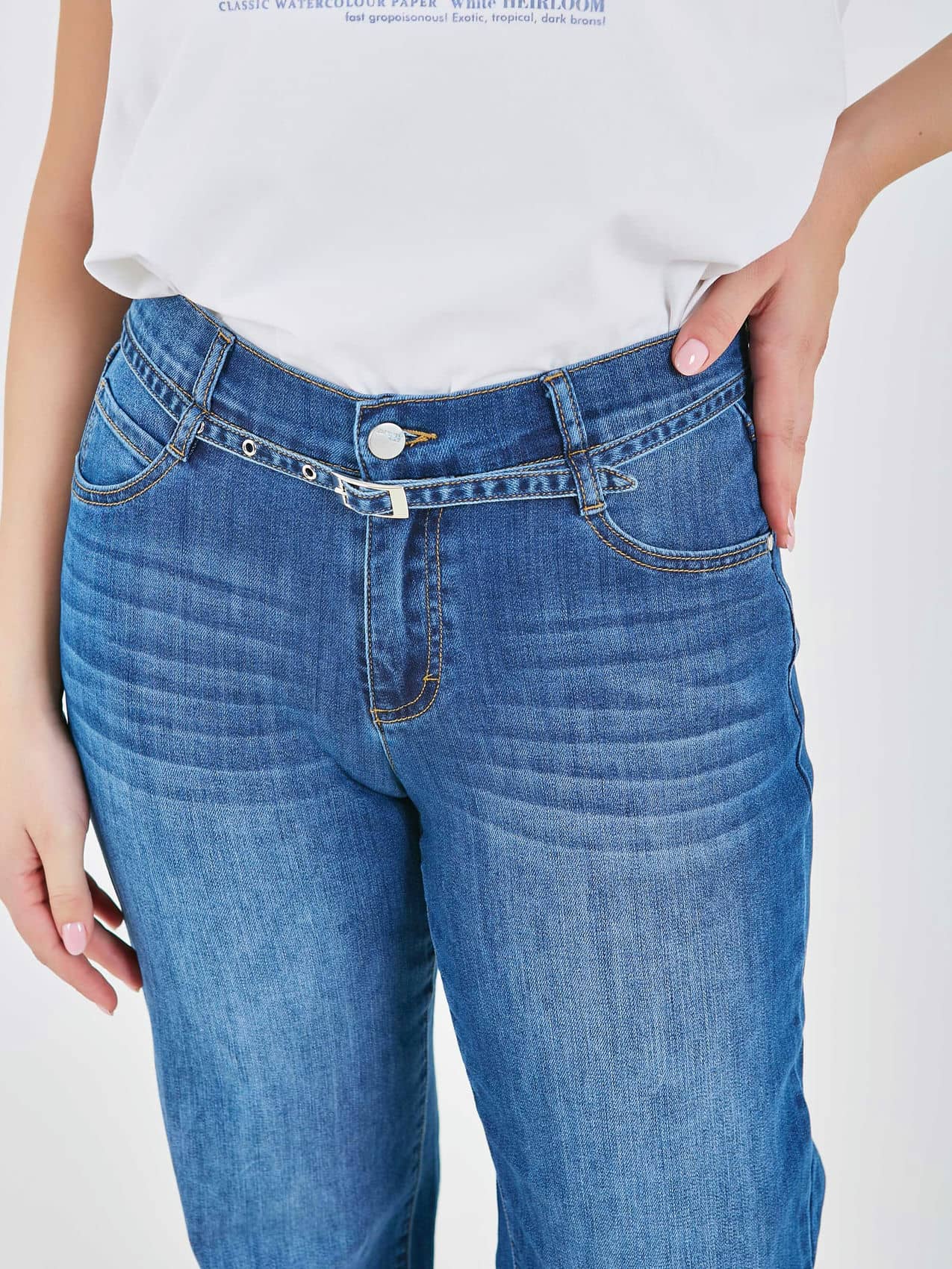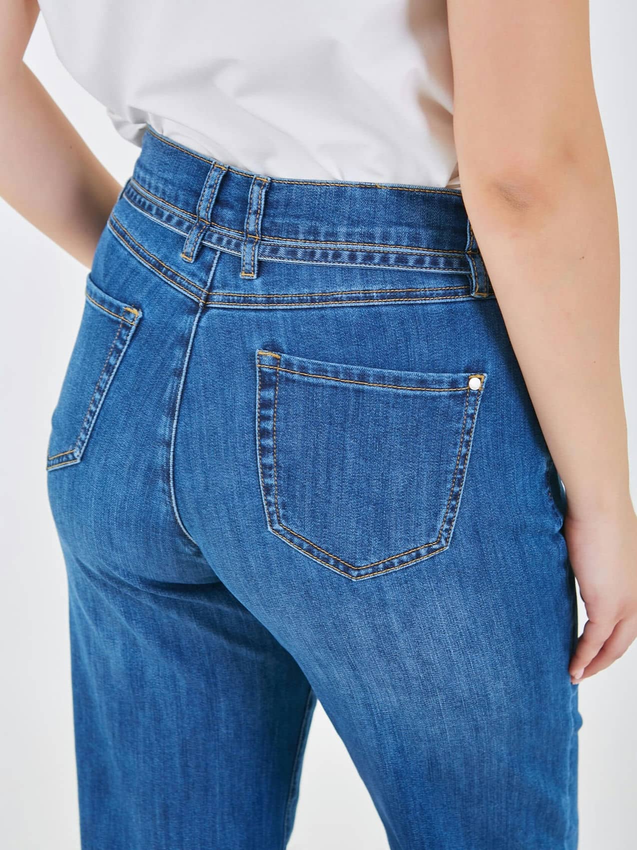 Джинсы прямого кроя на средней посадке с акцентным декоративным ремнем спереди. Коллекция Весна-Лето 2025-2026. Капсула "Сен-Тропе". Параметры модели: 95-64-101, рост 175, размер 44-46