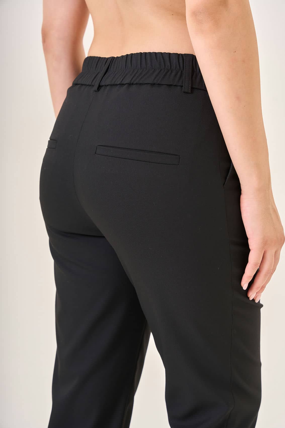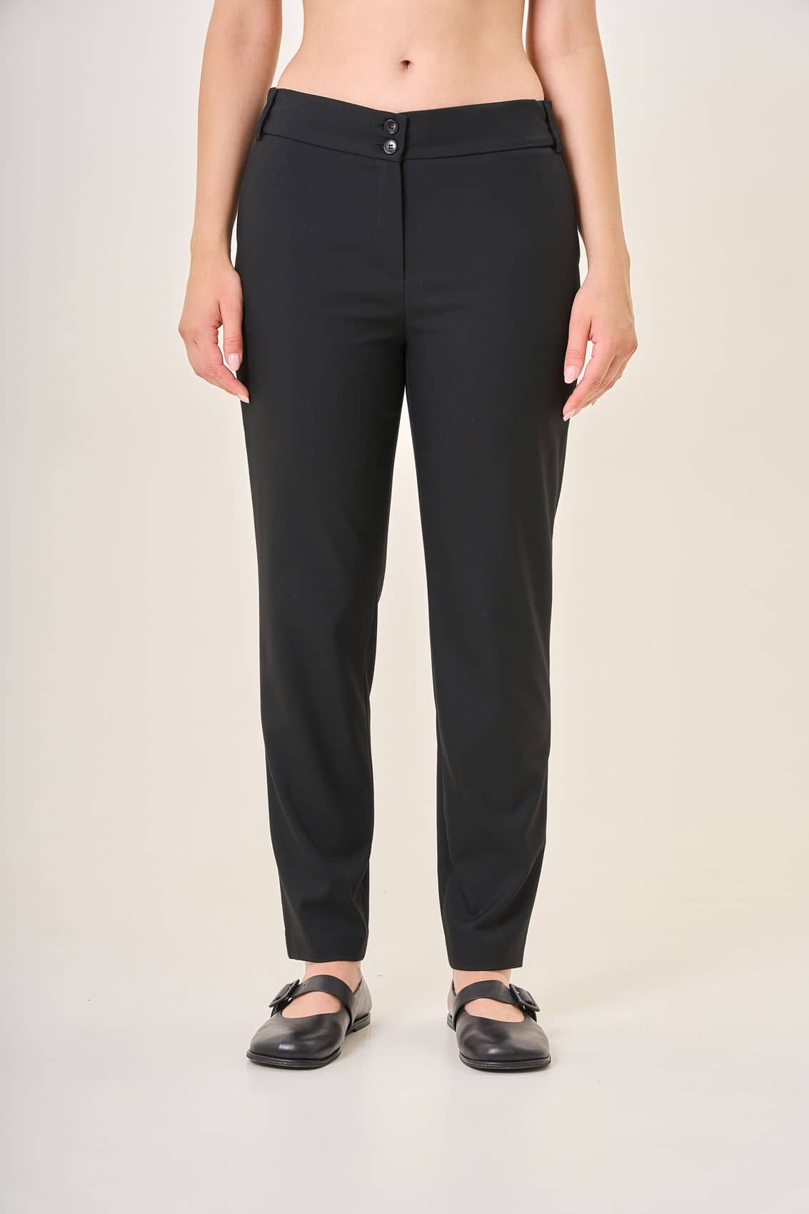 Женские классические брюки, слегка зауженные книзу. Комфортная посадка на талии и элегантный крой идеально подходят для офисного и повседневного гардероба. Сзади расположены два аккуратных накладных кармана, подчёркивающие классическую стилистику изделия. Плотная ткань сохраняет форму и выглядит презентабельно на любой фигуре.