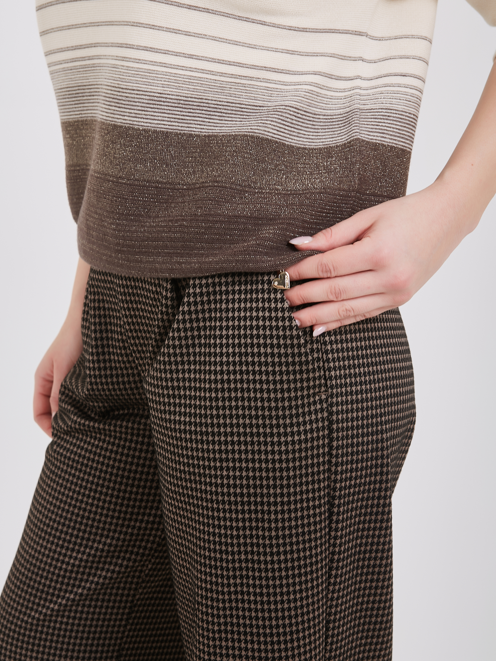 Женский кремовый джемпер свободного покроя. Рукава длиной три четверти и круглый вырез формируют изящный силуэт. Нижняя часть изделия украшена горизонтальными полосами, плавно переходящими от светлых тонов к насыщенным оттенкам коричневого, создавая динамичный визуальный эффект. Мягкий качественный материал обеспечивает комфорт и уют в любую погоду.Осень-Зима'25/26. Капсула "Вино из одуванчиков"
