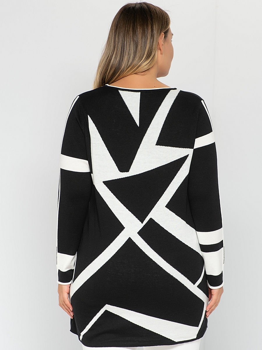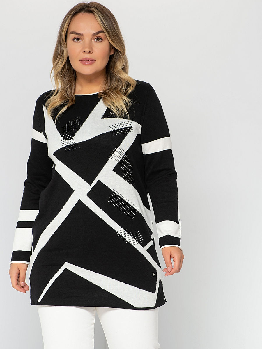 Удлиненный джемпер привлекает внимание своим контрастным геометрическим рисунком. Слегка приталенный силуэт, круглый вырез горловины, втачные рукава полной длины. Декор стразами создает более демократичный образ. Материал из хлопковой смеси приятен к телу и удобен в ношении.