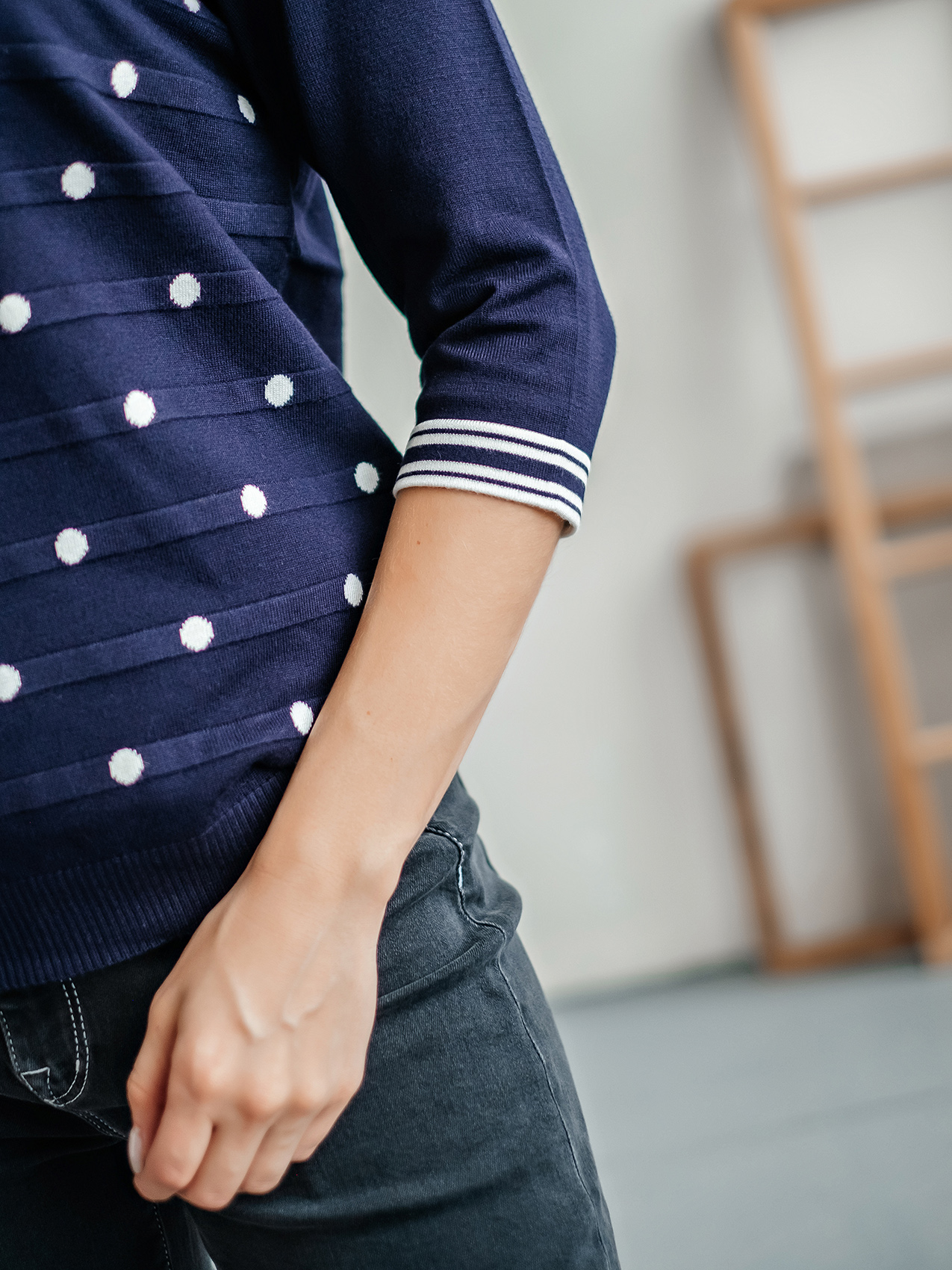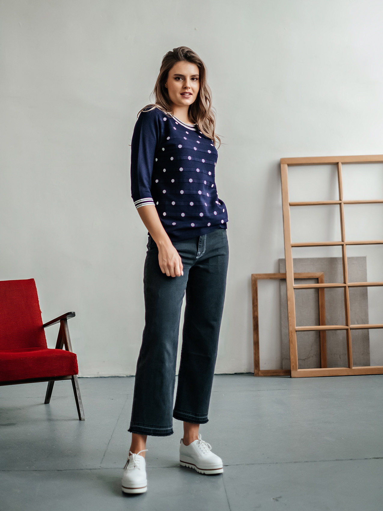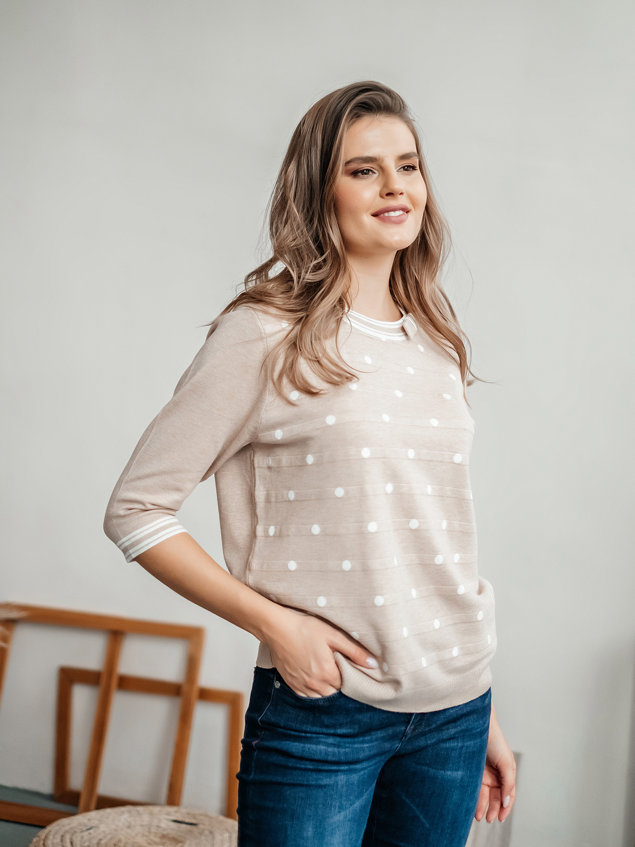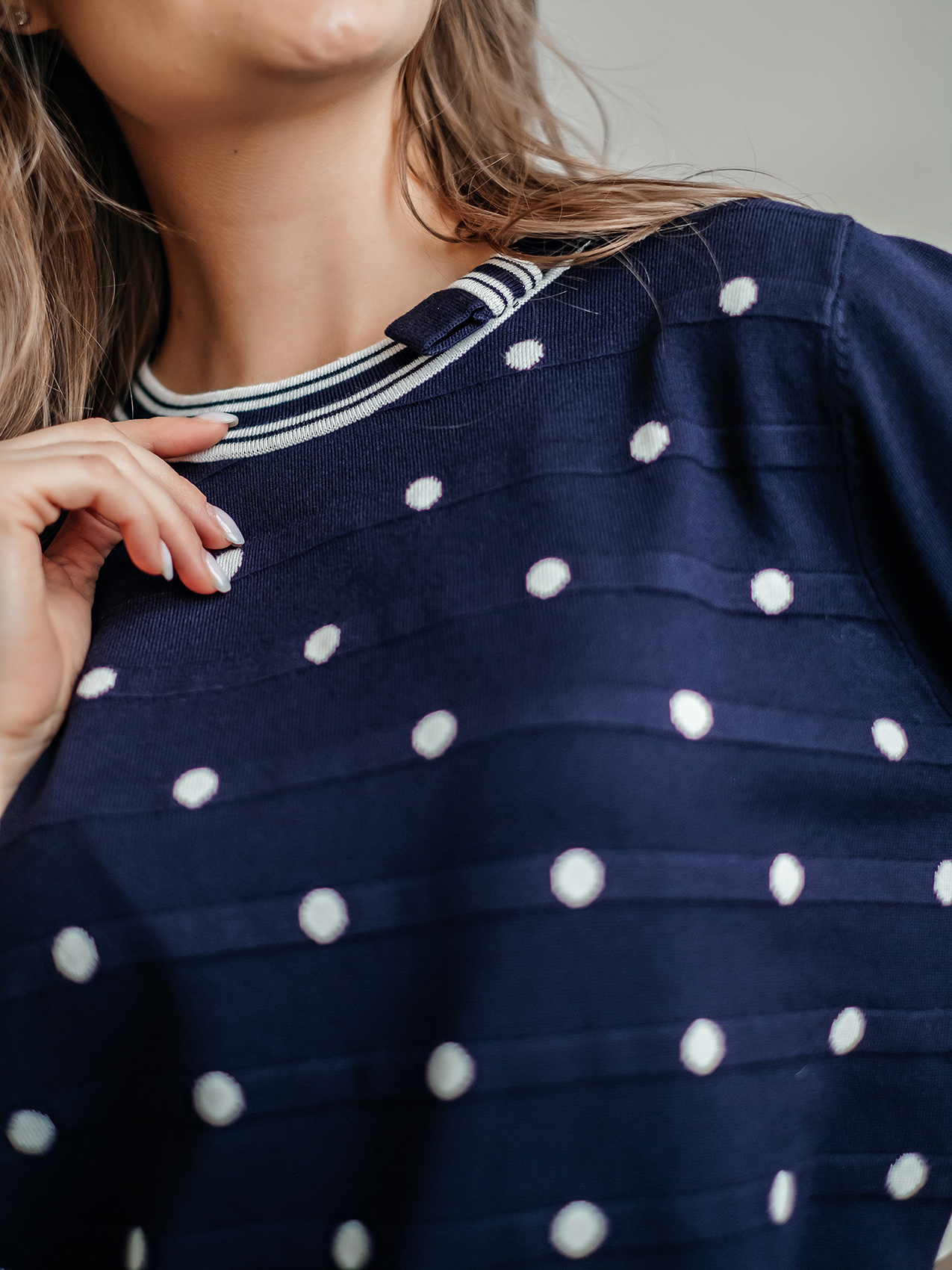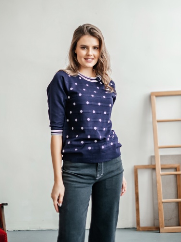 Теплый джемпер в горох - стильный вариант на каждый день. Свободный покрой, круглый вырез горловины и втачные рукава 3/4. Вырез оформлен декоративным элементом в виде банта. Приятный к телу материал из вискозной смеси обеспечивает комфорт.